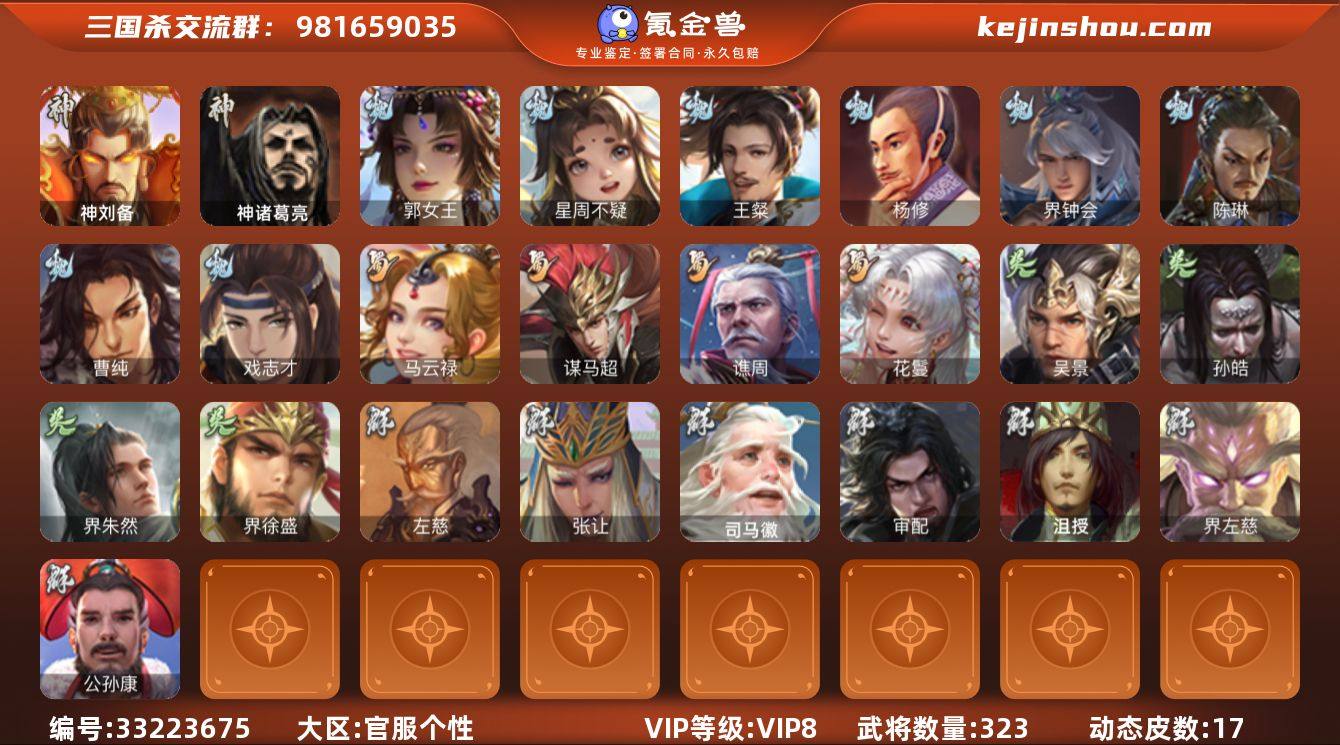 【84】官阶:骠骑将军;VIP等级:VIP8;史诗武将数量:26;动态皮肤数量:17;武将总数:323;史诗宝珠数量:14;将魂数量:0;神将:4;魏国史诗武将:12;蜀国史诗武将:4;吴国史诗武将:4;群史诗武将:10