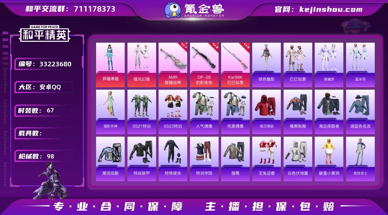 LK264702 可二次安卓 手Q-2粉装-4特效枪-0载具-2粉色飞行器-25590热力值-5王牌印记-67套装-98枪皮 【粉色套装】:粉装-镜光幻境,角色-异瞳寒姬 【粉色枪皮等级】:Kar98K-巳巳如意(五级),Mk14-福马献瑞(一级),AMR-智耀战神(七级),DP-28-豹影疾电(五级) 【粉色枪皮】:Kar98K-巳巳如意,Mk14-福马献瑞,AMR-智耀战神,DP-28-豹影疾电 【粉色飞行器】:炫彩糖果飞行器,极意拳锋飞行器 【粉色降落伞】:洛神天依降落伞,镜光幻境降落伞,雪月幻音降落伞,异瞳寒姬降落伞,炫彩糖果降落伞 【稀有套装】:套装-巳巳如意,套装-雪国风尚,套装-炫彩糖果,套装-马上有钱,套装-紫幽梦,套装-蓝冰羽,角色-猎影月神,角色-绯色魅影,角色-月烬之祷 【稀有枪皮】:AUG-冰晶雪宝,AKM-灼热熔岩,AKM-破晓战魂,AKM-龙的传人,M16A4-幻世战舞者,M16A4-红色方程式,SCAR-L-夜灯,SCAR-L-炫彩节奏,SCAR-L-玉兔迎春,SCAR-L-红色方程式,M416-红色方程式,M416-蓝色火焰,AUG-耀粉歌者,QBZ-洛神天依,M762-登顶巅峰,G36C-星穹咏叹调,UZI-天降萌叽,UZI-炫彩节奏,UMP45-夜灯,Vector-生命誓言,汤姆逊-耀粉歌者,P90-巳巳如意,Kar98K-影袭,Kar98K-红色方程式,M24-影袭,AMR-喜...