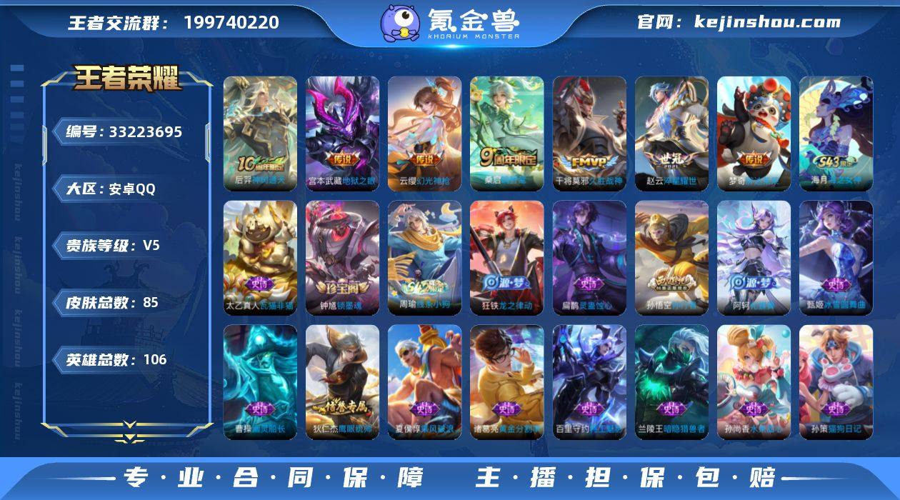 安卓Q-V5-尊贵铂金II段位-96英雄-71皮肤-6传说-16史诗 【传说皮肤】:后羿神树通天,云缨幻光神枪,桑启鸣野蒿,赵云淬星耀世,梦奇胖达荣荣,宫本武藏地狱之眼 【限定皮肤】:姜子牙天穹之誓,狄仁杰阴阳师,赵云皇家上将,项羽海滩派对,孙悟空孙行者,李元芳云中旅人,桑启海盐诗旅,鬼谷子天穹祈灯,鲁班七号蔬乡物语,李元芳蔬乡物语,刘邦剑破天穹,程咬金群星魔术团,刘备异域游侠,周瑜熔金海岸 【赛季限定】:李元芳云中旅人,桑启海盐诗旅,鬼谷子天穹祈灯,刘邦剑破天穹,姜子牙天穹之誓 【战令限定】:鲁班七号蔬乡物语,李元芳蔬乡物语 【史诗皮肤】:赵云皇家上将,貂蝉圣诞恋歌,甄姬冰雪圆舞曲,宫本武藏鬼剑武藏,孙尚香水果甜心,夏侯惇乘风破浪,兰陵王暗隐猎兽者,诸葛亮黄金分割率,百里守约特工魅影,刘禅天才门将,孙策猫狗日记,狄仁杰鹰眼统帅,孙悟空孙行者,鲁班七号蔬乡物语,阿轲化蝶舞,狂铁龙之律动 【其他皮肤】:项羽海滩派对,韩信教廷特使,韩信街头霸王,白起白色死神,安琪拉玩偶对对碰,妲己少女阿狸,典韦黄金武士,亚瑟死亡骑士,达摩拳王,后羿阿尔法小队,狄仁杰阴阳师,李白敏锐之力,鲁班大师乓乓大师,李元芳云中旅人,刘备潮玩...