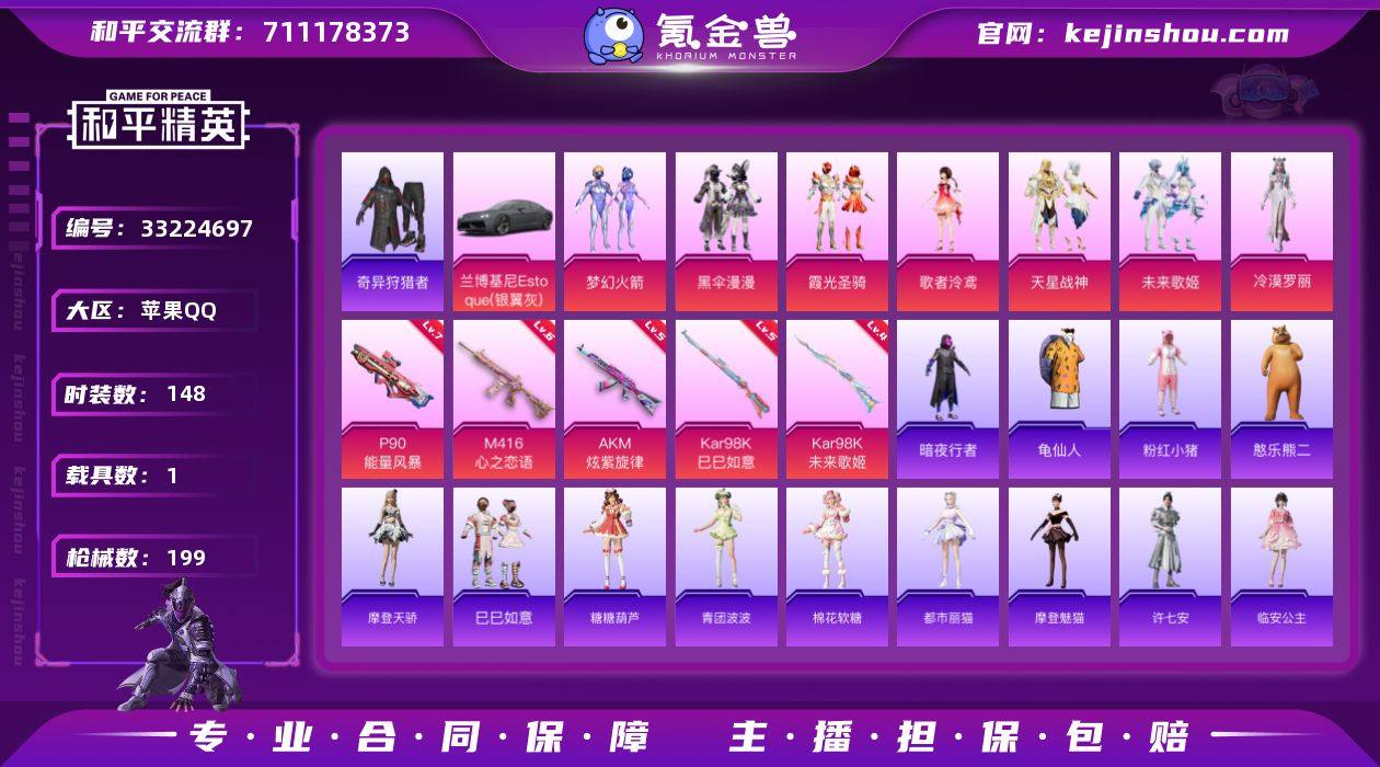 苹果 【小号 粉装-梦幻火箭/粉装-未来歌姬/角色-冷漠罗丽/AKM-炫紫旋律(五级)/M416-心之恋语(六级)/兰博基尼Estoque(银翼灰)/梦幻火箭背包】手Q-7粉装-5特效枪-1载具-6粉色飞行器-66051热力值-9王牌印记-148套装-199枪皮 【热门品类】:粉装-梦幻火箭,套装-奇异狩猎者,套装-暗夜行者,套装-龟仙人,套装-粉红小猪 【粉色套装】:粉装-梦幻火箭,粉装-黑伞漫漫,粉装-霞光圣骑,角色-歌者泠鸢,粉装-天星战神,粉装-未来歌姬,角色-冷漠罗丽 【粉色枪皮等级】:AKM-炫紫旋律(五级),M416-心之恋语(六级),P90-能量风暴(七级),Kar98K-未来歌姬(四级),Kar98K-巳巳如意(五级) 【粉色载具】:兰博基尼Estoque(银翼灰),僚机-擎天重拳 【粉色枪皮】:AKM-炫紫旋律,M416-心之恋语,P90-能量风暴,Kar98K-未来歌姬,Kar98K-巳巳如意 【粉色飞行器】:红伞翩翩飞行器,闪光银龙飞行器,太空嘟嘟飞行器,歌者泠鸢飞行器,脆鲨七海飞行器 【粉色降落伞】:暗夜玫瑰降落伞,环太平洋降落伞,太空嘟嘟降落伞,暗夜鎏金降落伞,海螺星光降落伞,音爆索尼克降落伞,第五大道降落伞,飒粉甜心降落伞,天星战神降落伞,未来歌姬降落伞,拂晓神骑降落伞,炫光之旅降落伞,未来领航者降...