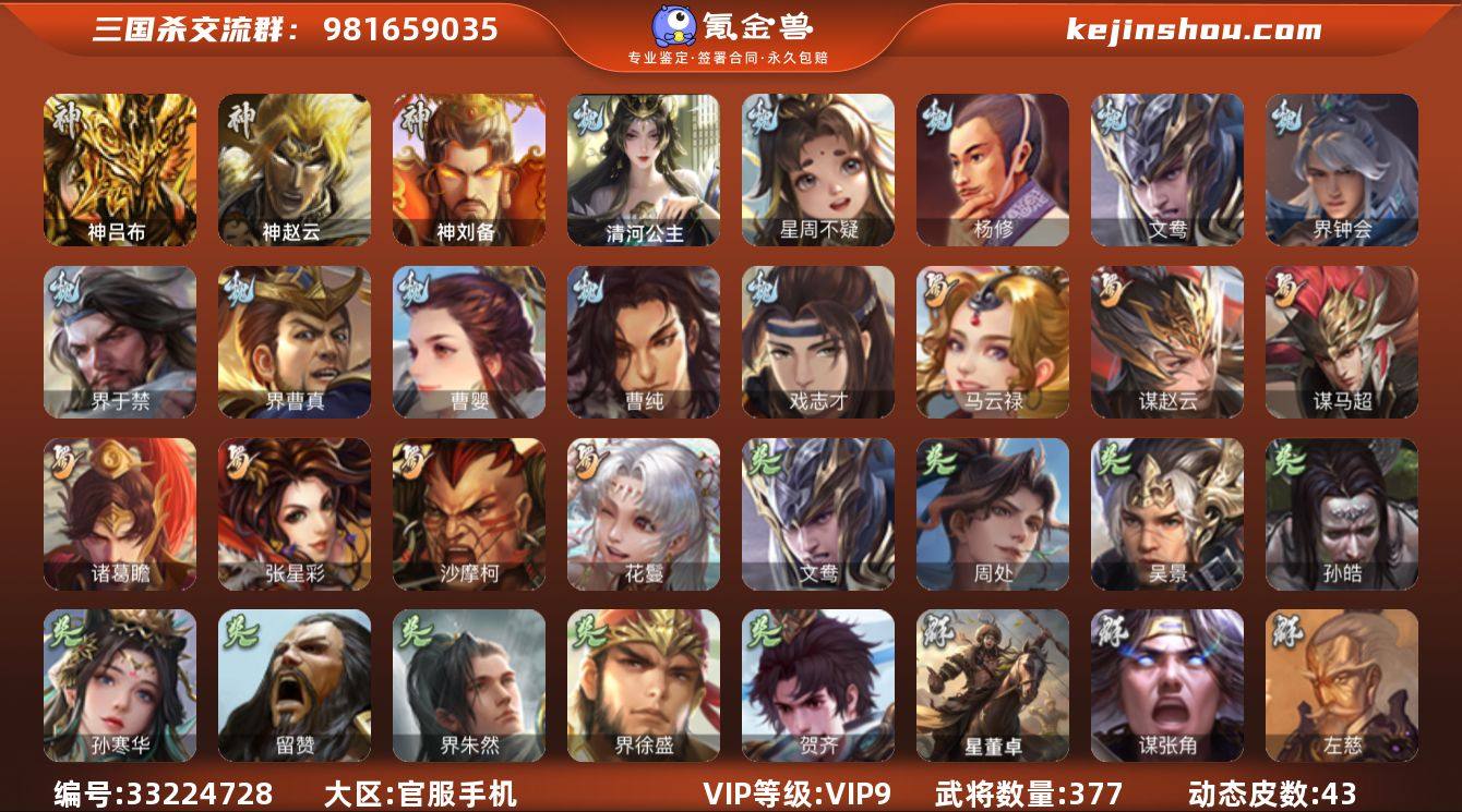 【588】官阶:大将军;VIP等级:VIP9;史诗武将数量:42;动态皮肤数量:43;武将总数:377;史诗宝珠数量:10;将魂数量:1827;神将:4;魏国史诗武将:24;蜀国史诗武将:7;吴国史诗武将:8;群史诗武将:13