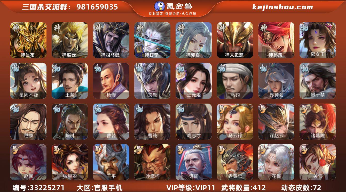 【814】官阶:大将军;VIP等级:VIP11;史诗武将数量:59;动态皮肤数量:72;武将总数:412;史诗宝珠数量:30;将魂数量:6861;神将:9;魏国史诗武将:16;蜀国史诗武将:12;吴国史诗武将:7;群史诗武将:20