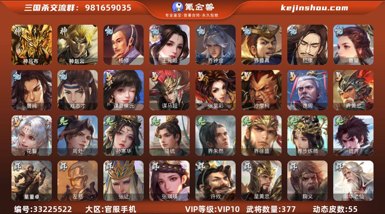 【973】官阶:大将军;VIP等级:VIP10;史诗武将数量:39;动态皮肤数量:55;武将总数:377;史诗宝珠数量:20;将魂数量:1583;神将:4;魏国史诗武将:13;蜀国史诗武将:7;吴国史诗武将:7;群史诗武将:15 神吕布,神赵云,神吕蒙,神周瑜,杨修,王元姬,魏-司马昭,界钟会,界曹真,嵇康,曹婴,曹纯,戏志才,谋夏侯氏,谋马超,张星彩,沙摩柯,谯周,界黄忠,花鬘,周处,孙寒华,骆统,界朱然,界徐盛,界步练师,贺齐,左慈,张让,张琪瑛,星黄忠,麹义,南华老仙,沮授,界左慈,界李儒,公孙康,张绣,李傕,许攸,友徐庶,星董卓,神吕布-监兵噬魅(动态),甄姬-明珠耀躯(动态),SP蔡文姬-兔年冬日(动态),曹婴-兔年春节(动态),朱灵-以战破氐(动态),曹纯-长坂败备(动态),司马昭-昭威淮南(动态),星徐晃-斧引霹雳(动态),花鬘-依心缱绻(动态),关羽-明良千古(动态),诸葛亮-虎年中秋(动态),诸葛亮-明良千古(动态),界诸葛亮-明良千古(动态),夏侯氏-明良千古(动态),关索-虎年七夕(动态),鲍三娘-虎年七夕(动态),李丰-太仓聚粟(动态),胡金定-明良千古(动态),诸葛果-蛇年限定(动态),周处-义除三害(动态),孙寒华-莲华熠熠(动态),孙寒华-威灵尽显(动态),周瑜-免年清明(动态),孙权-牛年七夕(动态),孙尚香-兔年春节(动态),大乔-猪...