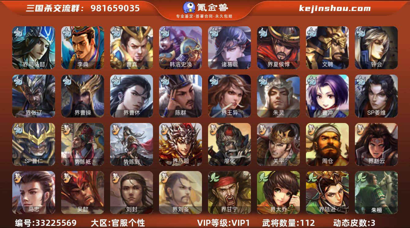 【4267】官阶:先锋将军;VIP等级:VIP1;史诗武将数量:0;动态皮肤数量:3;武将总数:112;史诗宝珠数量:72;将魂数量:4513;神将:0;魏国史诗武将:0;蜀国史诗武将:0;吴国史诗武将:0;群史诗武将:0/界曹操/界司马懿/界夏侯惇/界张辽/钟会/曹冲/曹真/韩浩史涣/陈群/界王异/界曹休/诸葛诞/SP姜维/文聘/SP曹仁/李典/朱灵/华雄/袁术/界吕布/界袁术/公孙瓒/伏皇后/李儒/蔡夫人/界公孙瓒/伏完/SP太史慈/势陈到/势陈祗/界刘备/界赵云/界马超/廖化/关平/刘封/吴懿/周仓/马忠/界甘宁/界黄盖/界周瑜/界大乔/界陆逊/程普/韩当/虞翻/孙鲁班/朱桓/顾雍/孙休/界韩当/诸葛瑾/孙鲁育/大乔小乔/潘濬/卫温诸葛直/张布/陆逊-蛇年清明(动态)/李儒-业火毒计(动态)/皇甫嵩-奋钺振旅(动态)/陶谦-安民护祚(动态)