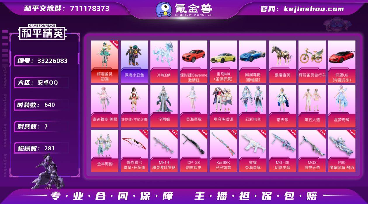 7载具-178套装-281枪皮--1红装8载具10粉装11特效枪9热门178套装281枪皮 92113热力值 10印记 历史绝世王牌13星 【1红装】 辉羽雀灵-初翊 (2级) 【8载具】 保时捷Cayenne(激情红) 宝马M4(圣保罗黄) 仰望U9(赤霞丹朱) 幽澜尊爵(静谧蓝) 冰绡玉鳞 黑曜夜骑 辉羽雀灵自行车 萌兔起飞僚机 【10粉装】 狂花道·不知火舞 宁雨蝶 奇迹舞步美雪 洛天依 荧海星豚 金丰海韵 星穹咏叹调 星梦奇缘 幻彩电音 第五大道 【11特效枪】 P90-魔童闹海敖丙 (3级) M416-灵猫魔法师 (3级) Kar98K-巳巳如意 (5级) MG-36-幻彩电音 (4级) MG3-辉羽雀灵 (3级) DP-28-豹影疾电 (5级) 蜜獾-荧海星豚 (4级) Mk14-精灵梦叶罗丽 (7级) MG3-洛神天依 (4级) Mk14-福马献瑞 (5级) 爆炸猎弓-拳皇·狂花道 (7级) 【9热门】 龟仙人 浪漫假日 雪山精英 小狗蛇点点 鹰眼刺客 深海小丑鱼 暗影哥特 破蛋小黄鸡 极速红龙 营地ID: