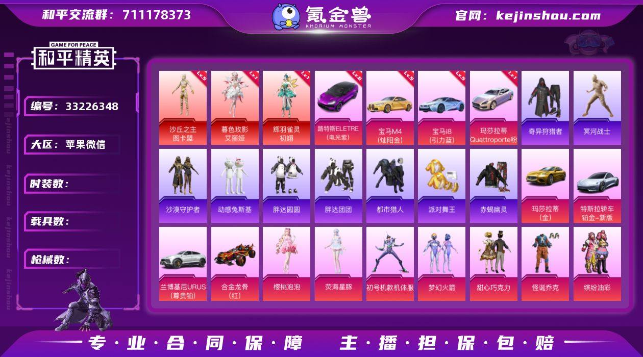 编号63443果V可改,21印记,5级图卡盟,艾丽娅,初翊,雪国,木乃伊,螳螂,小丑,赤蝎,金鞋子,黑丝,新101,巧克力,放客,猪妹,小叽,金鞋子,飞龙,洛天依,狂魅哈莉,灵感,白勺,第五大道,小白龙,满级路特斯,5级M4,5级I8,升级玛莎,红蹦蹦,铂特,金摩托,灵猫魔法师,暮色玫影,星梦奇缘,最终圣卫者,沙丘之主,辉羽雀灵, 43特8满6计数9淘汰,18载具1船1僚机,66粉3红,送璀璨碎片,近23W热力