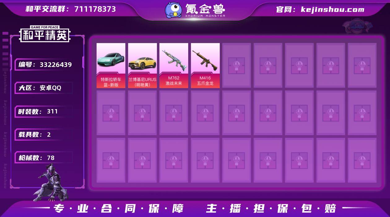 【947209】[18239745]实名: 可修改 时装数: 311 载具数: 2 枪械数: 78 战备数: 2 热门装扮: 浪漫波比,梦魇先生,万圣娃娃,爱崽白熊,恒星战甲,东方飞龙 载具: 特斯拉Roadster(水滴蓝),兰博基尼URUS(明艳黄) 稀有枪皮: M416五爪金龙,M762激战未来,Kar98K-巳巳如意