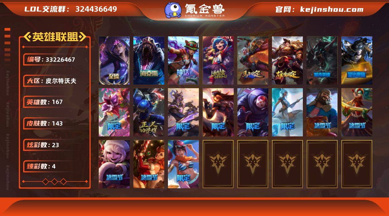 未定级段位-167英雄-143皮肤-23炫彩-0终极-4神话-21限定-11传说-35史诗 【珍稀头像】:红包头像 【神话皮肤】:十周年纪念安妮,十五周年纪念希维尔 【至臻皮肤】:至臻暗星女王黛安娜 【海克斯皮肤】:海克斯科技雷克顿 【臻彩皮肤】:无畏骑士瑟庄妮赤子初心,西部魔影卢锡安贝利尔之怠,魔女阿卡丽虚荣,水晶玫瑰斯维因纯洁花蕾 【年限皮肤】:替父从军花木兰,张辽文远 【冰雪限定】:圣诞精灵崔丝塔娜,圣诞糖果棒厄运小姐,阿木木“主人不要我了”,平安夜女神娑娜,英勇玩具兵普朗克,冰雪节格雷福斯 【限定皮肤】:SKTT1贾克斯,DWG奈德丽,暗裔英雄盖伦,胜利女神希维尔,胜利剑圣易,南瓜头费德提克,鬼影森森茂凯,泳池派对菲奥娜,蓝色忧郁崔斯特,暗影沃里克,防暴天使凯尔,惊悚派对费德提克 【传说皮肤】:大天使长米迦勒凯尔,源计划林易,双重冰晶艾尼维亚,灵能特工娑娜,红色男爵库奇,枯萎之壤泽拉斯,冰霜亚龙希瓦娜,符文战熊沃利贝尔,苍穹之光韦鲁斯,宇航员诺提勒斯,神龙尊者昼日真龙亚索 【史诗皮肤】:绞肉机角斗士赵信,铁血剑豪易,地狱火阿利斯塔,钢铁之心希维尔,源代码索拉卡,兔宝宝提莫,国王泰达米尔,黑色荆棘莫甘娜,殇之机器人阿木木,...