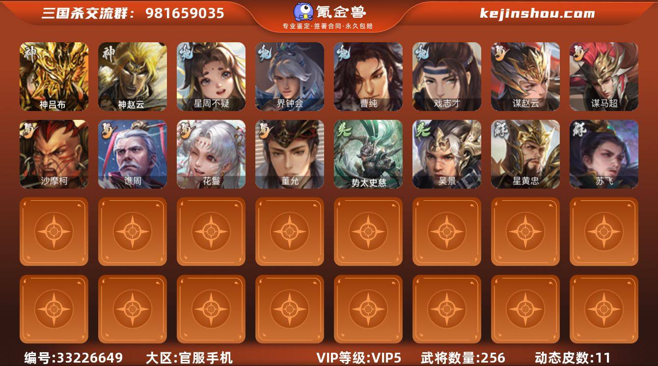 【2035】官阶:骠骑将军;VIP等级:VIP5;史诗武将数量:19;动态皮肤数量:11;武将总数:256;史诗宝珠数量:0;将魂数量:5021;神将:2;魏国史诗武将:8;蜀国史诗武将:6;吴国史诗武将:2;群史诗武将:2/神吕布/神赵云/界钟会/戏志才/曹纯/星周不疑/谋马超/谋赵云/花鬘/董允/沙摩柯/谯周/势太史慈/吴景/苏飞/星黄忠/荀彧-驱虎吞狼(动态)/钟会-谋谟之勋(动态)/曹昂-竭战鳞伤(动态)/关索-虎年七夕(动态)/诸葛果-虎年中秋(动态)/陆逊-龙年七夕(动态)/周处-义除三害(动态)/徐盛-破军杀将(动态)/孙权-永开吴祚(动态)/麹义-扬刀立威(动态)/左慈-蛇年限定(动态)