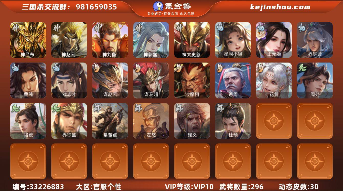 【824】官阶:骠骑将军;VIP等级:VIP10;史诗武将数量:25;动态皮肤数量:30;武将总数:296;史诗宝珠数量:0;将魂数量:3403;神将:7;魏国史诗武将:20;蜀国史诗武将:5;吴国史诗武将:3;群史诗武将:7