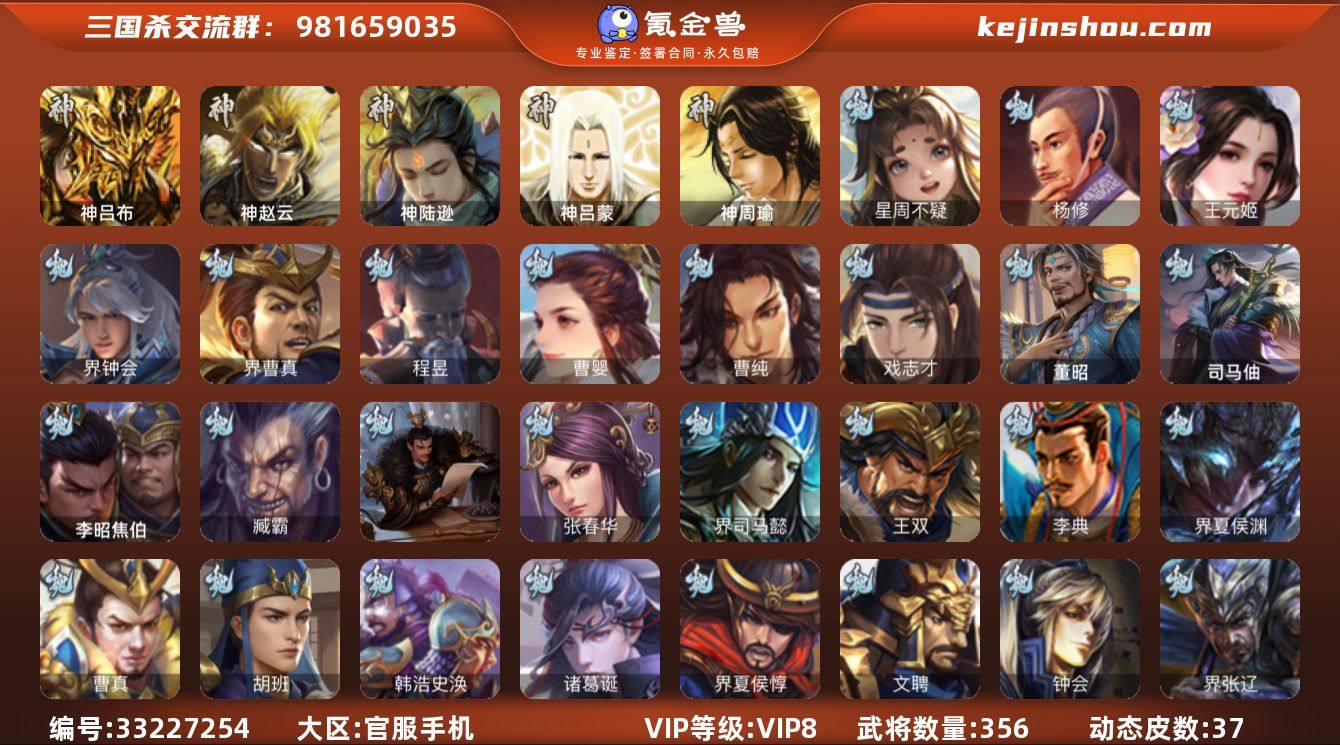 【2791】官阶:大将军;VIP等级:VIP8;史诗武将数量:36;动态皮肤数量:37;武将总数:356;史诗宝珠数量:18;将魂数量:6659;神将:3;魏国史诗武将:26;蜀国史诗武将:7;吴国史诗武将:7;群史诗武将:11