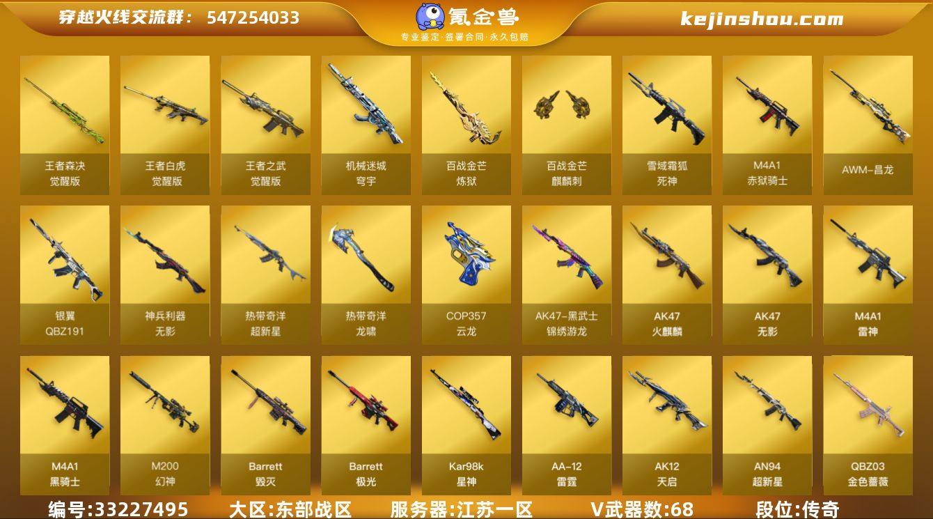 江苏一区-72V-4王者武器数-0炫金武器数 【传说角色】:传说星骇 【热门武器】:G36C-幻影,QBZ03-金色蔷薇,M200-幻神,M200-竞技荣光,死亡之眼,Kar98K-星神,M4A1-黑骑士,汤姆逊-烈龙,羊驼玩偶,沙鹰-修罗 【音效卡】:屠龙-电竞之星-竞星跃动音效卡,QBZ03-金色蔷薇-竞星跃动音效卡,M4A1-雷神音效卡,M4A1-黑骑士音效卡,QBZ03-金色蔷薇音效卡,HK417-朱雀-电竞之星-竞星跃动音效卡,炼狱-百战金芒-庆典舞曲音效卡,死神-雪域霜狐-怀旧音效卡,柯尔特-百战金芒-庆典舞曲音效卡,AWM-昌龙-怀旧音效卡,AK47-火麒麟-怀旧音效卡 【皮肤】:幻神-周瑜皮肤,幻神-星耀 皮肤,幻神-电流骇客 皮肤,金色蔷薇-量子蔷薇 皮肤,金色蔷薇-破浪逐光 皮肤,星神-璀璨皮肤,雷神-宇航兔皮肤,M4A1-再燃火线,火麒麟-轻羽皮肤,毁灭耀金皮肤,毁灭-英雄计划 皮肤,黑骑士-暗月,黑骑士-伏羲,无影-能量核心,修罗-星空,屠龙-破浪逐光 皮肤,轻型军用手斧-再燃火线 【角色】:星际战将,谜,零·纪元,战地猎狐,王者樱-热浪之夏,雪域霜狐,蛇隐宗,奇洋探员,乔伊教练,云海玲珑,葵-阿尔法武装,幻面灵狐,斗烈龙骑,暗夜-X,初恋灵狐,芳心审判者,飞虎队-X,风暴女,虎妞,嘉年华...