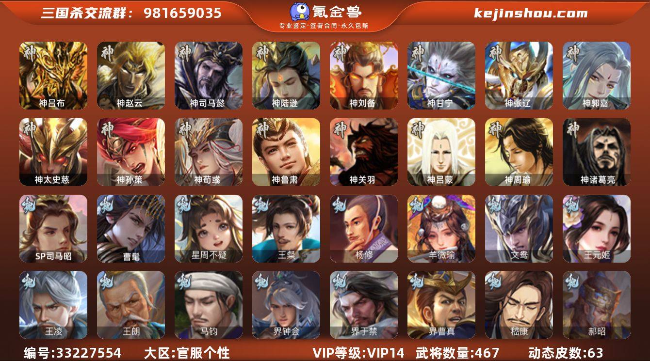 【3913】官阶:大将军;VIP等级:VIP14;史诗武将数量:86;动态皮肤数量:63;武将总数:467;史诗宝珠数量:19;将魂数量:23664;神将:13;魏国史诗武将:39;蜀国史诗武将:16;吴国史诗武将:13;群史诗武将:24/神诸葛亮/神吕布/神赵云/神司马懿/神陆逊/神刘备/神甘宁/神张辽/神郭嘉/神太史慈/神孙策/神荀彧/神鲁肃/郝昭/谋曹仁/王粲/王凌/界于禁/界钟会/界曹真/嵇康/程昱/戏志才/杨修/陈琳/曹婴/王朗/刘晔/王元姬/羊徽瑜/SP司马昭/曹髦/曹纯/马钧/星周不疑/王平/诸葛瞻/谋马超/谋赵云/谋黄忠/谋关羽/花鬘/界黄忠/马云騄/张星彩/董允/赵襄/关索/沙摩柯/周群/谯周/文鸯/谋黄盖/骆统/周处/吴景/界徐盛/界步练师/界朱然/贺齐/孙皓/留赞/孙寒华/左慈/许攸/界左慈/沮授/界李儒/界沮授/张让/麹义/陶谦/士燮/司马徽/卑弥呼/刘焉/王允/苏飞/张琪瑛/公孙康/兀突骨/杨彪/祢衡/庞德公/南华老仙/星甘宁/星黄忠/蒯越蒯良/王基/毌丘俭/势夏侯尚/谋徐晃/谋郭嘉/谋夏侯渊/谋于禁/卞夫人/华歆/袁涣/王双/崔琰/界曹操/界司马懿/界夏侯惇/界张辽/界许褚/界郭嘉/界甄姬/界夏侯渊/界曹仁/界典韦/界荀彧/界徐晃/界曹丕/界邓艾/张春华/钟会/曹冲/郭淮/满宠/曹真/韩浩史涣/陈群/曹叡/曹休/钟繇/界曹植/界王...