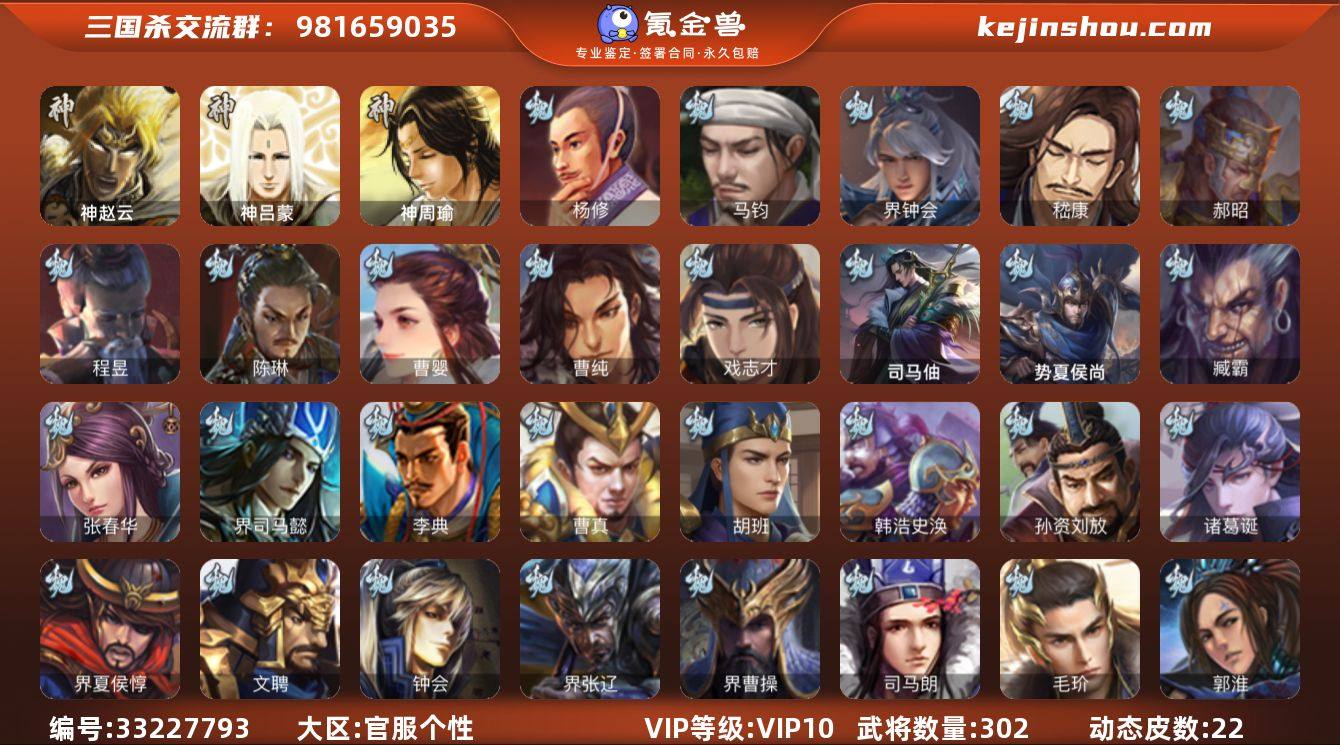 【JYSG33】官阶:骠骑将军;VIP等级:VIP10;史诗武将数量:30;动态皮肤数量:22;武将总数:302;史诗宝珠数量:0;将魂数量:2032;神将:1;魏国史诗武将:10;蜀国史诗武将:6;吴国史诗武将:4;群史诗武将:10