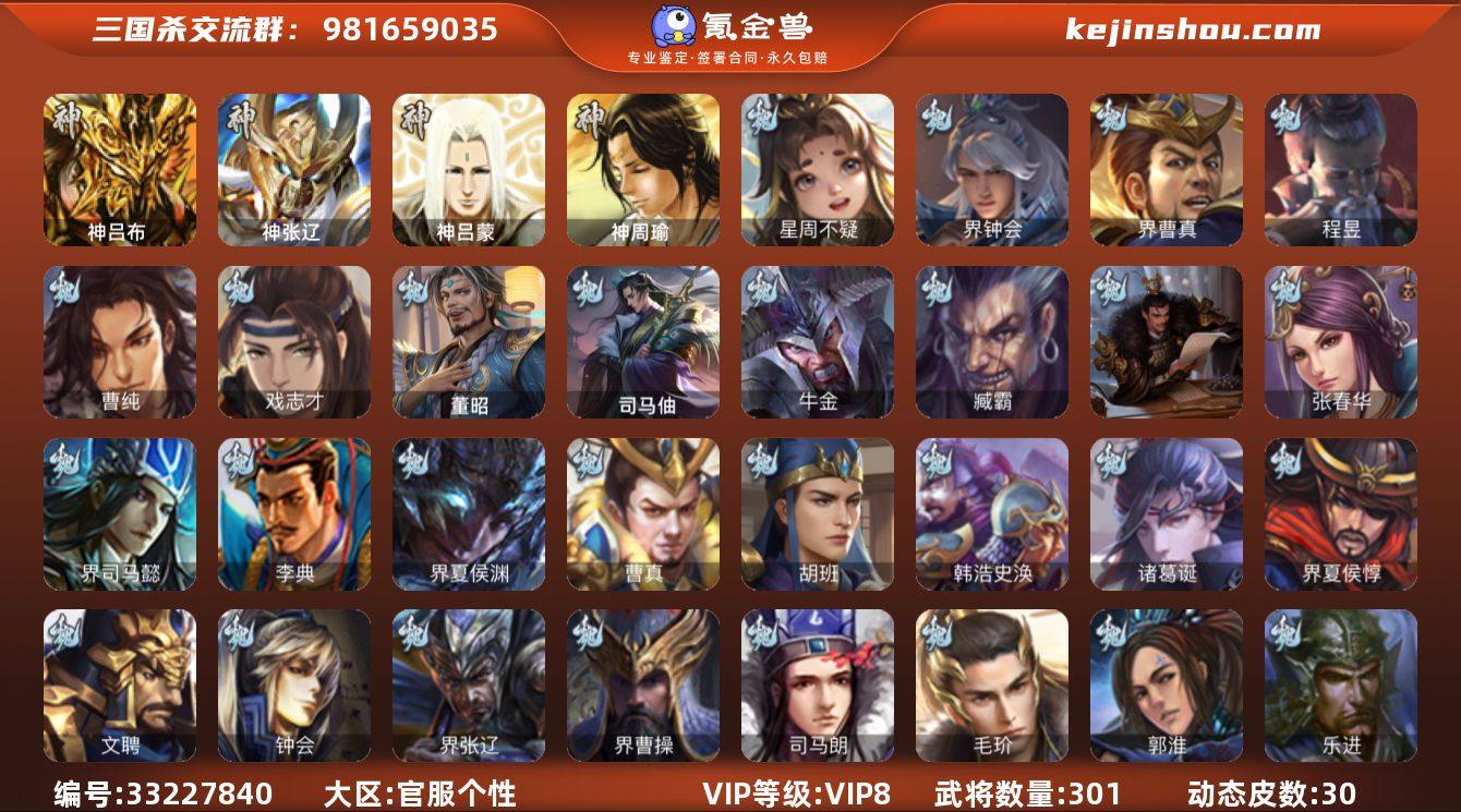 【4496】官阶:大将军;VIP等级:VIP8;史诗武将数量:26;动态皮肤数量:30;武将总数:301;史诗宝珠数量:87;将魂数量:5445;神将:2;魏国史诗武将:16;蜀国史诗武将:5;吴国史诗武将:2;群史诗武将:11