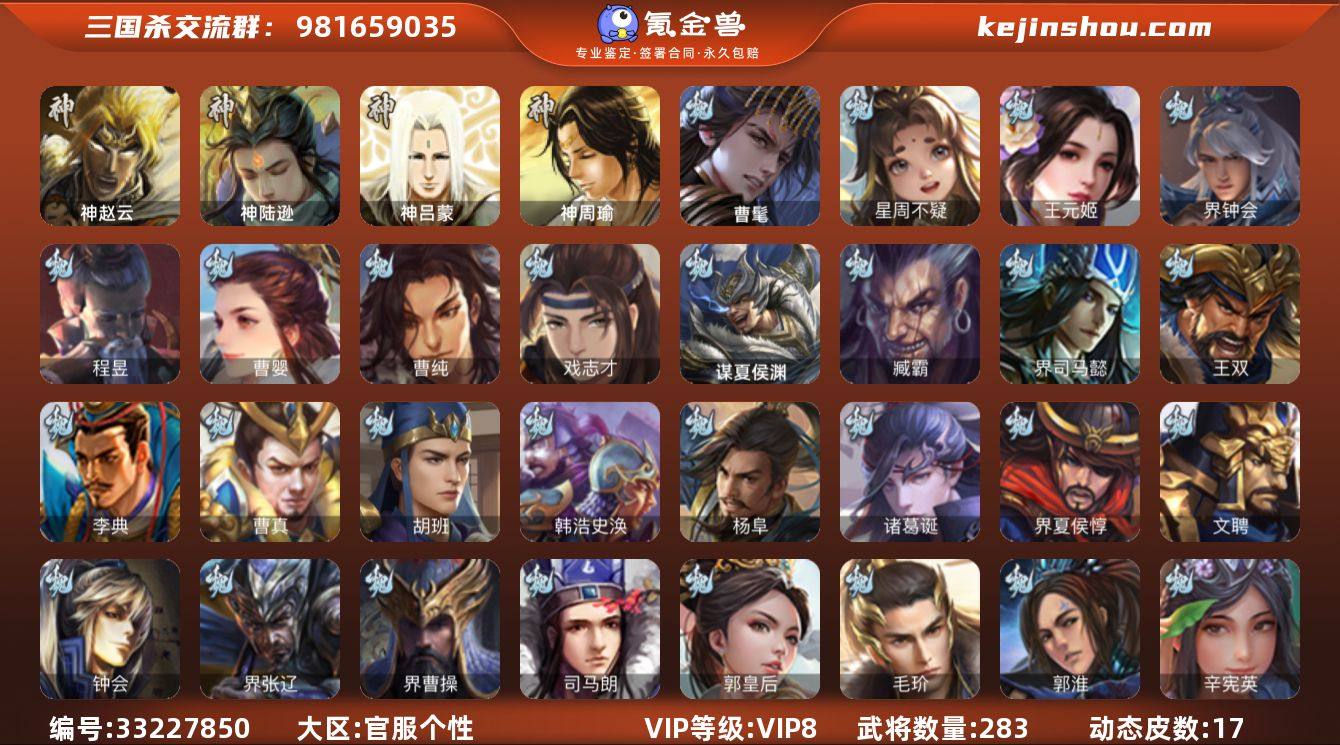 【4498】官阶:骠骑将军;VIP等级:VIP8;史诗武将数量:27;动态皮肤数量:17;武将总数:283;史诗宝珠数量:32;将魂数量:7825;神将:2;魏国史诗武将:8;蜀国史诗武将:3;吴国史诗武将:3;群史诗武将:12