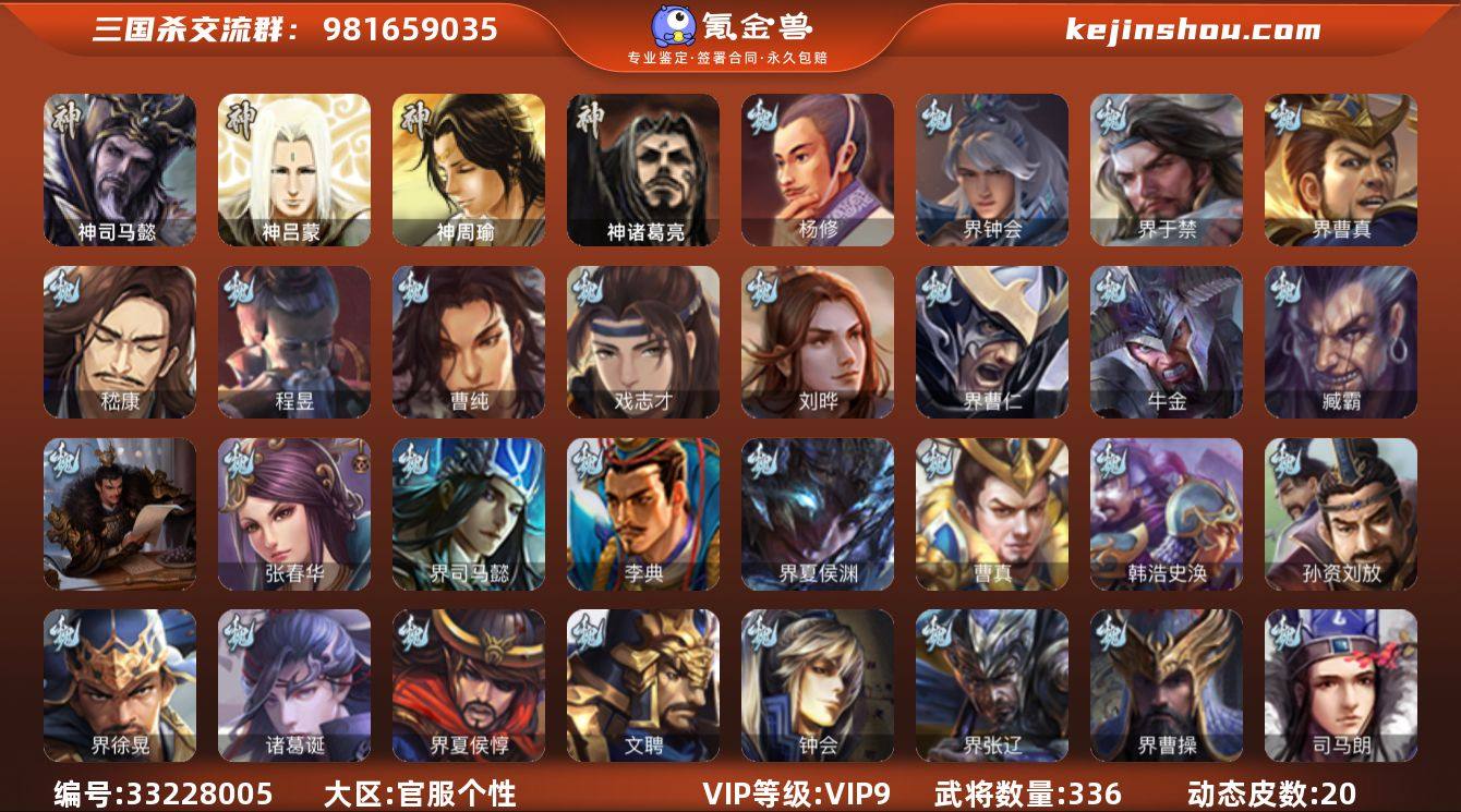 【4856】官阶:大将军;VIP等级:VIP9;史诗武将数量:27;动态皮肤数量:20;武将总数:336;史诗宝珠数量:0;将魂数量:0;神将:2;魏国史诗武将:15;蜀国史诗武将:7;吴国史诗武将:1;群史诗武将:9