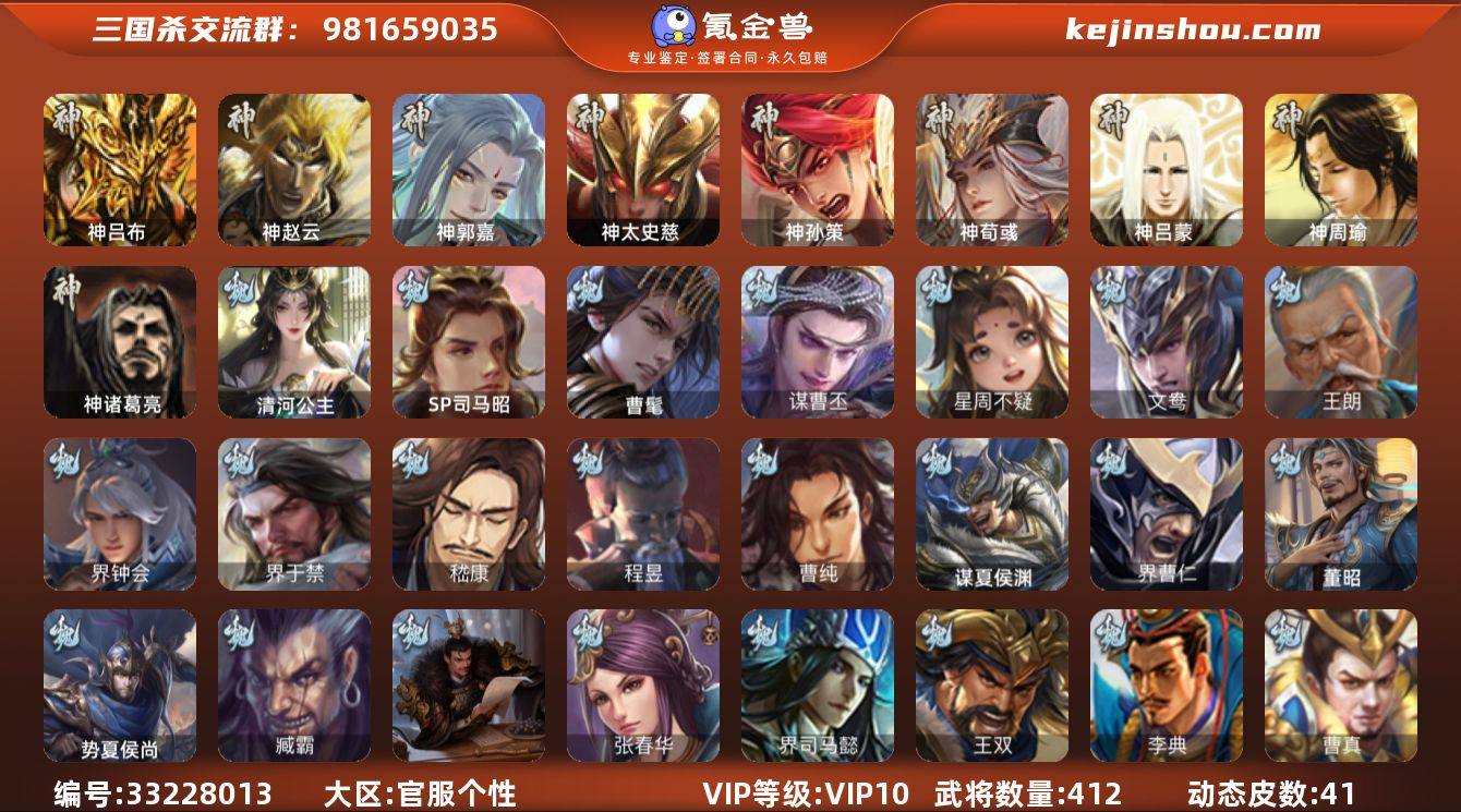 【4487】官阶:大将军;VIP等级:VIP10;史诗武将数量:52;动态皮肤数量:41;武将总数:412;史诗宝珠数量:0;将魂数量:5213;神将:7;魏国史诗武将:28;蜀国史诗武将:11;吴国史诗武将:9;群史诗武将:18 神吕布,神赵云,神郭嘉,神太史慈,神孙策,神荀彧,神诸葛亮,SP司马昭,曹髦,星周不疑,王朗,界钟会,界于禁,嵇康,曹纯,谋曹丕,清河公主,程昱,关索,谋赵云,谋马超,诸葛瞻,周群,赵襄,王平,沙摩柯,谯周,花鬘,董允,周处,骆统,界徐盛,界步练师,贺齐,文鸯,谋孙尚香,左慈,张让,杨彪,星黄忠,星甘宁,苏飞,麹义,刘焉,沮授,界左慈,界李儒,杜预,谋张角,许攸,星董卓,兀突骨,司马昭,神吕蒙,神周瑜,势夏侯尚,SP关羽,SP曹仁,SP蔡文姬,乐进,曹昂,诸葛诞,朱灵,文聘,SP姜维,张春华,钟会,曹冲,郭淮,满宠,界王异,界曹操,界司马懿,界夏侯惇,界张辽,界许褚,界郭嘉,李典,曹真,韩浩史涣,陈群,曹叡,曹休,钟繇,司马朗,王基,李通,郭皇后,孙资刘放,辛宪英,界甄姬,吕虔,鲁芝,蒯越蒯良,界典韦,界荀彧,界徐晃,杜畿,界曹丕,毌丘俭,张恭,贾逵,界曹植,界曹彰,界满宠,界郭淮,卞夫人,华歆,蔡贞姬,袁涣,王双,崔琰,毛玠,杨阜,阮慧,谋徐晃,界曹休,牵招,胡班,谋夏侯渊,界曹仁,臧霸,董昭,势陈到,SP孙尚香,关银屏,夏侯霸,马良,...