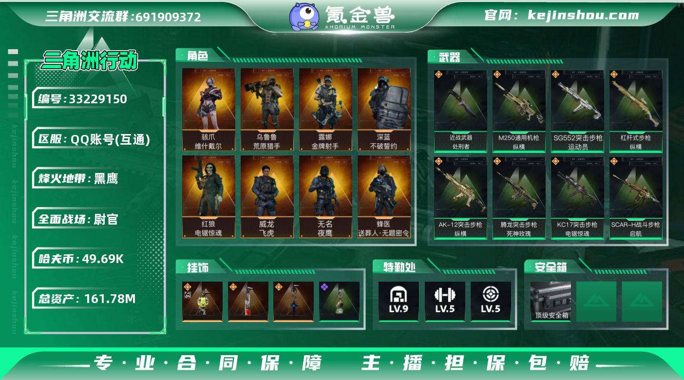 零号玩家永久3X3皮肤,威龙飞虎,骇爪红皮,基本上全干员有皮肤,绝版大红,还有近200三角券,高爆率,161M