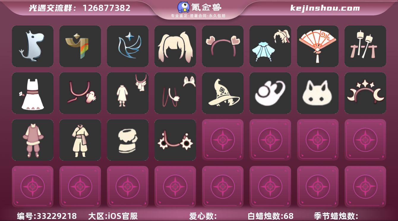 【A545】区服:国服ios,登入方式:手机【4季卡】无翼新年裤连衣裙拖鞋巫师帽正太头樱花头猫猫头,蜡烛数量:68,翼数量:永久无翼,当前身高13.489,最高身高1.599,最矮身高13.599,已经毕业季节:青鸟季,彩染季,姆明季,稀有礼包:祥云瑞气服饰,彩虹武士裤,向日葵连衣裙,史力奇套装,玉兔拖鞋,雪人暖心靴,吸蟹伯爵面具,星月头冠,日光耳环,树精肩饰,姆明饰品套装,巫师帽,渐变双马尾发型,玉兔,史力奇帽子,心心相印发饰,献瑞折扇礼包,篝火点心,青衫落拓礼包,向日葵耳坠,粽子头饰,小黄鸭头饰,向日葵之裙,热门物品:正太头,樱花头,猫猫头,宴会围巾