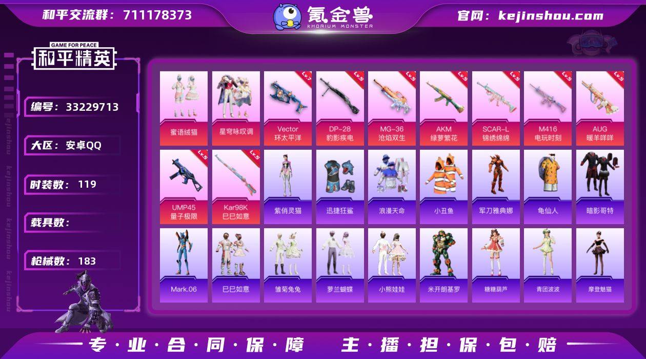 【kyhp559】安卓 手Q-3粉装-13特效枪-0载具-2粉色飞行器-54143热力值-10王牌印记-119套装-183枪皮 【热门品类】:套装-浪漫天命,套装-小丑鱼,角色-军刀雅典娜,套装-龟仙人,套装-暗影哥特,角色-Mark.06 【粉色套装】:粉装-蜜语绒猫,粉装-星穹咏叹调,角色-罪夜之冕 【粉色枪皮等级】:AKM-绿萝繁花(五级),SCAR-L-锦绣绵绵(五级),M416-电玩时刻(五级),AUG-暖羊咩咩(五级),UMP45-量子极限(五级),Vector-环太平洋(七级),AKS-74U-森灵之息(五级),Kar98K-巳巳如意(五级),DP-28-豹影疾电(五级),MG-36-沧焰双生(五级) 【粉色枪皮】:AKM-绿萝繁花,SCAR-L-锦绣绵绵,M416-电玩时刻,AUG-暖羊咩咩,UMP45-量子极限,Vector-环太平洋,AKS-74U-森灵之息,Kar98K-巳巳如意,Mk14-辉云木星,Mk14-福马献瑞,DP-28-豹影疾电,MG-36-沧焰双生 【粉色飞行器】:炫彩糖果飞行器,极意拳锋飞行器 【粉色降落伞】:荧光虫舞降落伞,环太平洋降落伞,未来歌姬降落伞,精灵梦叶罗丽降落伞,忍者神龟降落伞,千金淑猫降落伞,智耀战神降落伞,星穹咏叹调降落伞,炫彩糖果降落伞 【稀有套装】:套装-龟仙人,套装-巳巳如意,套装-炫彩糖果,套装-雏菊兔兔,套装-萝兰蝴蝶,套装-小熊...