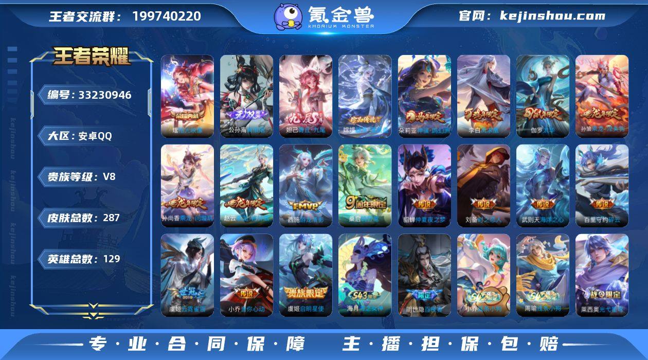 安卓Q-V8-最强王者段位-128英雄-284皮肤-1典藏皮肤-1典藏英雄-2无双-1珍品传说-15传说-82史诗 【荣耀典藏】:武则天英雄,瑶拾光映像 【无双皮肤】:公孙离离恨烟,妲己青丘九尾 【珍品传说】:嫦娥器灵落星盏 【传说皮肤】:朵莉亚神骥鸣幻洲,桑启鸣野蒿,孙尚香乘龙问璇玑,孙策乘龙淬吴钩,赵云乘龙铭钟鼎,百里守约碎云,西施游龙清影,小乔音你心动,虞姬启明星使,刘备时之恋人,伽罗太华,虞姬云霓雀翎,貂蝉仲夏夜之梦,李白凤求凰,武则天海洋之心 【限定皮肤】:公孙离离恨烟,蔡文姬夏日便利店,姜子牙天穹之誓,狄仁杰阴阳师,赵云皇家上将,孙尚香蔷薇恋人,鲁班七号狮舞东方,庄周高山流水,扁鹊奇幻香踪,芈月重明,吕布猎兽之王,周瑜赤莲之焰,夏侯惇朔风刀,甄姬游园惊梦,曹操烛龙,典韦穷奇,典韦蓝屏警告,狄仁杰魔术师,狄仁杰万华元夜,达摩沙漠行僧,项羽海滩派对,老夫子醍醐杖,程咬金演武夺筹,韩信飞衡,兰陵王金庭之子,花木兰青春决赛季,花木兰默契交锋,孙悟空大圣娶亲,牛魔御旌,后羿圣弓游侠,李元芳云中旅人,虞姬启明星使,钟馗神迹守卫,钟馗驱傩正仪,杨玉环遇见飞天,女娲朔望之晖,干将莫邪真爱魔法,雅典娜黎明之约,蔡文姬奇迹圣...