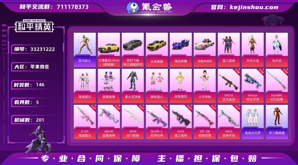 0违规,冥河战士,洛天依,军刀雅典娜,红红火火,齐天大圣,苹果 微信-9粉装-10特效枪-5载具-1粉色飞行器-70265热力值-12王牌印记-146套装-201枪皮 【热门品类】:套装-冥河战士,角色-军刀雅典娜,套装-金羽特工,角色-忠义严颜,套装-龟仙人,套装-红红火火 【粉色套装】:粉装-星之彼岸,粉装-齐天大圣,角色-洛天依,粉装-海渊国主,粉装-蓝莓炮弹,角色-复仇流浪者,粉装-飒粉甜心,角色-呆萌星弥,角色-小可学妹 【粉色枪皮等级】:AKM-白勺歌姬(四级),SCAR-L-机甲封神(四级),M416-五爪金龙(六级),AUG-星之彼岸(四级),Vector-环太平洋(五级),Kar98K-巳巳如意(五级),S12K-海渊国主(五级),M249-蓝莓炮弹(五级),DP-28-枪炮玫瑰(四级),MG3-洛神天依(四级) 【粉色载具】:兰博基尼URUS(明艳黄),宾利飞驰(布罗德盖棕双色),永恒黄蜂,海龙奔腾,软萌羊咩咩 【粉色枪皮】:AKM-白勺歌姬,SCAR-L-机甲封神,M416-五爪金龙,AUG-星之彼岸,Vector-环太平洋,Kar98K-巳巳如意,S12K-海渊国主,M249-蓝莓炮弹,DP-28-枪炮玫瑰,MG3-洛神天依 【粉色飞行器】:齐天大圣飞行器 【粉色降落伞】:星之彼岸降落伞,机甲封神降落伞,暗夜玫瑰降落伞,齐天大圣降落伞,洛神...