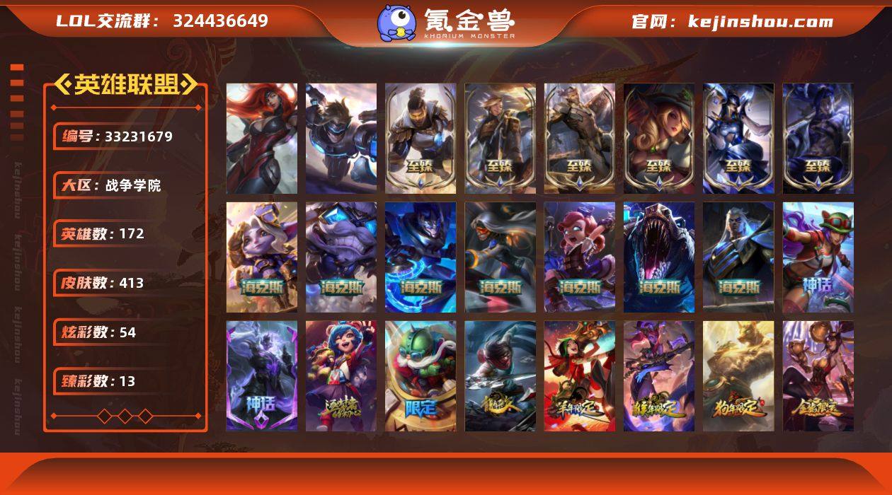 【LSA1460】172英雄/413皮肤/2终极/17神话/54限定/13臻彩/54炫彩/37传说/91史诗/未定级账号等级:842/10周年 安妮/十五周年纪念 希维尔/10周年庆典 凤凰/灰烬守护者 慎/至臻 魅惑女巫 莫甘娜/至臻 灵能特工 伊泽瑞尔/至臻 青花瓷 丽桑卓/至臻 墨之影武者 亚索/至臻 未来战士 卢锡安/至臻 源计划:逆流 塞拉斯/海克斯 安妮/海克斯 希维尔/海克斯 崔丝塔娜/海克斯 斯维因/海克斯 雷克顿/海克斯 嘉文四世/海克斯 吉格斯/天龙之子 卡莎 飞龙乘云/无畏骑士 瑟庄妮 赤子初心/霸天巨兽·雪崩 墨菲特/幻灵战斗兔 锐雯 梦幻强袭/魔女 阿卡丽 虚荣/净雪之月 莫甘娜 冬虹/幽梦玫瑰 泰隆 浪漫花蕾/银龙裁决 泰隆/神龙烈焰 金克丝/玉净夜叉 凯特琳/北辰之威 内瑟斯/烈焰美人 薇恩/王国机神青龙 德莱文/王国机神苍狼 瑟提/点心宝贝 阿木木/龙马烈焰波比/碎心之拳 蔚/冰雪风暴 希维尔/圣诞精灵 崔丝塔娜/“主人不要我了” 阿木木/平安夜女神 娑娜/冬季仙境 发条/雪默丁格/魄罗骑士 瑟庄妮/寒冬精灵 璐璐/冰雪节 炼金/未来战士/武装战姬/斩星魔剑 易/冠军典狱长 锤石/冠军之血 希瓦娜/冠军之矛 卡莉丝塔/S1FNC 嘉文四世/S1FNC 卡尔萨斯/S1FNC 库奇/S2 暗杀星 发条/S2 暗杀星 慎/S4 SSW 图奇/S4 SSW...