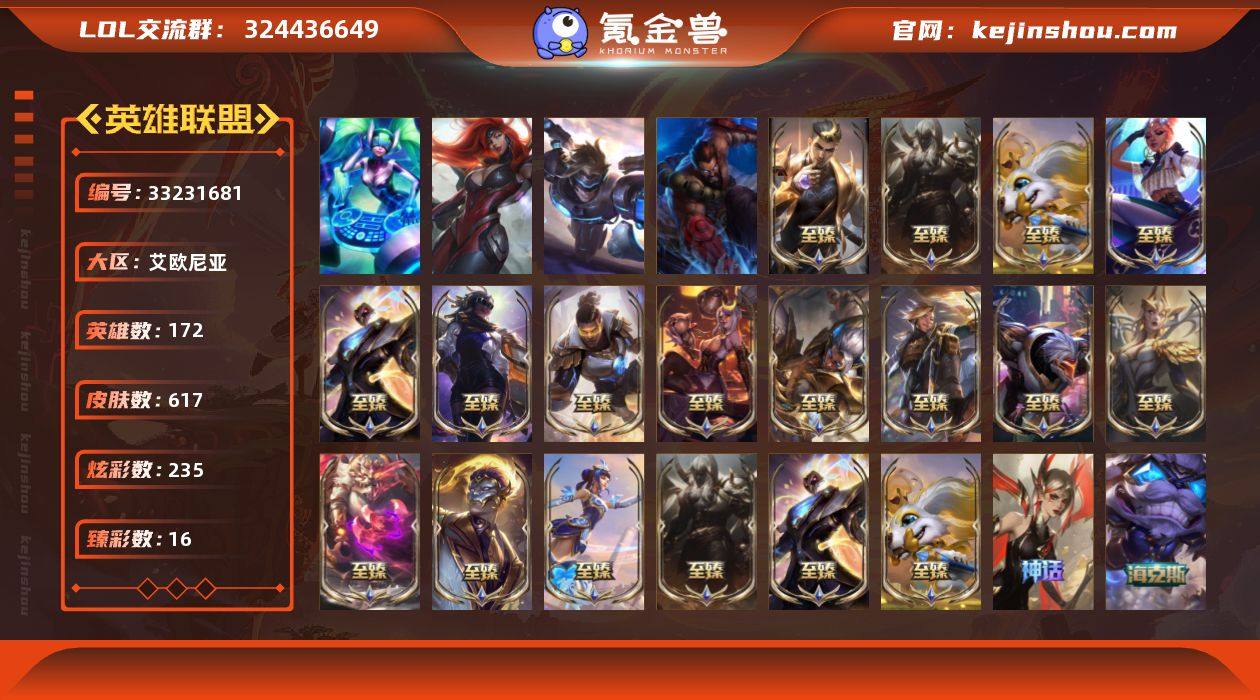 【LSA1462】172英雄/617皮肤/4终极/35神话/98限定/16臻彩/235炫彩/56传说/141史诗/未定级账号等级:640/卡特琳娜的匕首/10周年 安妮/源代码 乐芙兰/殿堂传奇 乐芙兰/十五周年纪念 希维尔/暗星 科加斯/10周年庆典 凤凰/黎明使者 卡尔玛/永恒之森 奥恩/灰烬骑士 派克/至臻 魔女 乐芙兰/至臻 焰执事 布兰德/至臻 烈焰美人 薇恩/至臻 灵能特工 伊泽瑞尔/至臻 青花瓷 拉克丝/至臻 绒毛菲兹/至臻 绒毛 菲兹(2022)/至臻 神龙尊者均衡之龙 沃利贝尔/至臻 T1 杰斯/至臻 真实伤害 赛娜/至臻 未来战士 卢锡安/至臻 源计划:阴 劫/至臻 真实伤害 奇亚娜/至臻 腥红之月 亚托克斯/至臻 腥红之月 亚托克斯(2022)/至臻 未来战士 锤石/至臻 未来战士 锤石(2022)/至臻 神龙尊者 炎龙瑟提/海克斯 希维尔/海克斯 阿木木/海克斯 卡萨丁/海克斯 嘉文四世/摄魂 薇恩/海克斯 波比/海克斯 瑟庄妮/海克斯 吉格斯/天龙之子 卡莎 飞龙乘云/无畏骑士 瑟庄妮 赤子初心/冰霜之刃 艾瑞莉娅 炫金/墨之影武者 亚索 金墨耀影/征服者 韦鲁斯 炫金/幻灵战斗狼 塞拉斯 梦幻强袭/泳池派对 奥莉安娜 优雅珠光鲸/灵魂莲华 卡西奥佩娅 流火/可爱可爱粉红红 布里茨/殿堂传奇 乐芙兰 登神/魔女 阿卡丽 虚荣/净雪之月 莫甘娜...