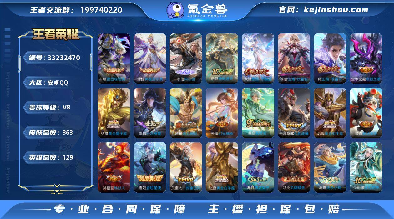 安卓Q-V8-至尊星耀V段位-129英雄-363皮肤-2典藏皮肤-1无双-17传说-112史诗 【英雄全皮】:刘禅全皮,狂铁全皮,李信全皮,猪八戒全皮,敖隐全皮,空空儿全皮,影全皮 【荣耀典藏】:铠银白咏叹调,虞姬神鉴启示录 【无双皮肤】:李信问心剑 【传说皮肤】:后羿神树通天,女娲愿照千秋盛,云缨幻光神枪,桑启鸣野蒿,吕布遇见神鼓,东皇太一灼幽烈阳,曜山海苍雷引,李信山海炽霜斩,虞姬启明星使,李信一念神魔,张良黄金白羊座,干将莫邪久胜战神,达摩黄金狮子座,梦奇胖达荣荣,后羿黄金射手座,宫本武藏地狱之眼,孙悟空地狱火 【限定皮肤】:白起狰,蒙犽顽岩魄,蔡文姬夏日便利店,虞姬夏日便利店,姜子牙天穹之誓,杨戬破阵退雄兵,狄仁杰阴阳师,赵云皇家上将,赵云引擎之心,墨子神迹守卫,嬴政优雅恋人,鲁班七号狮舞东方,庄周高山流水,高渐离玩趣恶龙,钟无艳超时空战士,扁鹊奇幻香踪,白起夜都怪侠,芈月重明,芈月幻夜卜梦,吕布遇见神鼓,周瑜赤莲之焰,元歌云间偶戏,元歌无心,夏侯惇朔风刀,甄姬落雪兰心,曹操烛龙,典韦穷奇,典韦蓝屏警告,马可波罗暗影游猎,狄仁杰魔术师,狄仁杰万华元夜,达摩星际陆战队,达摩沙漠行僧,项羽海滩派对,老夫子醍醐杖...