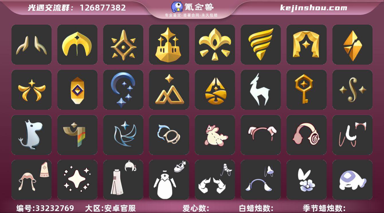 账号类型: 手机账号 季节已毕业: 圣岛季,预言季,梦想季,潜海季,表演季,破晓季,欧若拉季,集结季,夜行季,追忆季,拾光季,归巢季,九色鹿季,筑巢季,二重奏季,姆明季,彩染季,青鸟季,双星季,织光季 完成地图: 晨岛,云野,雨林,霞谷,暮土,禁阁,全图毕业 珍稀物品: 阿努比斯(狗头),白枭,透明蝶翼斗 礼包: 蝙蝠套,巫师,围巾,星球斗,欧若拉之翼,九色鹿角,音乐桌,鹿角,蜘蛛斗,兔子鞋,秋千,瑞雪,跷跷板,小船,灯笼,红伞,兔子,南瓜,枯角,雪花,tgc,星月头饰,彩虹耳钉,彩虹耳机,蝴蝶结,奥利奥,四叶草,滑板,爱心眼镜,透明蛛丝,新年耳钉,创始人,飞鸟纸伞,妮妮斗篷,献瑞折扇礼包,渐变双马尾发型礼包,心心相印发饰礼包,小狗周年发饰,粽子发饰礼包,必胜客联动装扮礼包,必胜客联动分享披萨背饰礼包,青衫落拓礼包,周年影院套餐礼包,线框斗篷礼包,小黄鸭雨衣套装礼包,小黄鸭发饰礼包,蝴蝶与花发饰礼包,暗陨斗篷礼包,小海牛配饰礼包,活力海牛礼包,冥龙套装礼包,周年燕尾服斗篷,周年礼包,鹊桥相会套装,记忆水晶礼包,日光水母套装礼包,皮皮猫套装礼包,云音伴游耳机,绿茸茸卷耳发饰礼包,骐骥迎福礼包 裤子: 武士裤,背带裤,白棉裤,搓澡巾 面具: 黄鼠狼,红狐狸,阿努比斯 面饰: 红耳机,黑框眼镜 项链: 围巾 发...