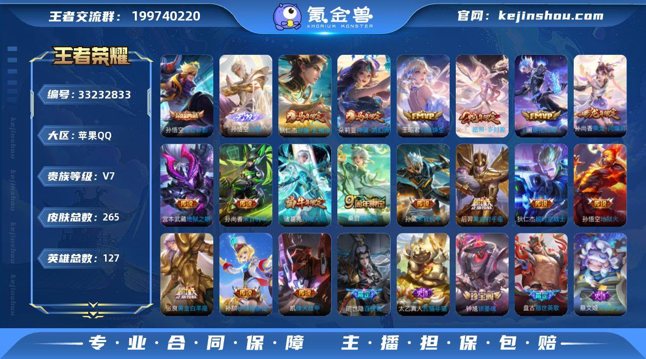 【945245】[18121592]实名: 可修改 性别: 男号 贵族等级: V7 英雄数: 127 皮肤数: 265 荣耀水晶: 全息碎影 无双皮: 无相 传说皮: 黄金射手座,绛天战甲,黄金白羊座,末日机甲-孙尚香,地狱火,地狱之眼,超时空战士-狄仁杰,末日机甲-孙策,小动物乐团,澜逐花归海,乘龙·问璇玑,长夜焕生,神骥·赴朔漠,神骥·鸣幻洲 限定皮: 李小龙,游园惊梦,梁祝,御风骁将,时雨天司,飞衡,至尊宝,如梦令-后羿,大圣娶亲,高山流水,五谷丰年,鸣野蒿,愿照·岁时盈 亮点: 【优质装备】:全息碎影(猴子典藏),黄金射手座,绛天战甲(鸡嘴战神),黄金白羊座,末日机甲-孙尚香(绿蚂蚱),地狱火,地狱之眼,超时空战士-狄仁杰,末日机甲-孙策,小动物乐团,澜逐花归海,涂山容容