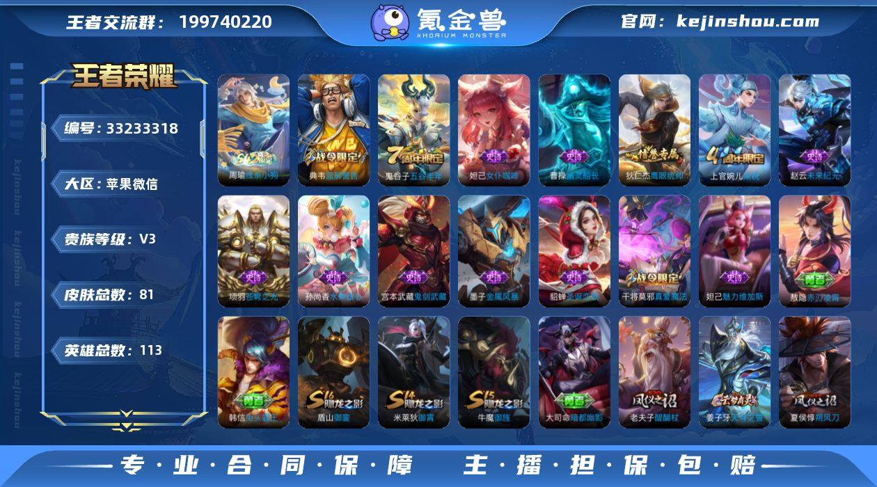 AL697827 【wx小号王者】 皮肤数81 英雄数113 营地id1828166952 贵族等级【文本】贵族3级 【贵族3级】 【是】 限定皮肤23 赛季限定16 史诗皮肤15 战令限定4 勇者皮肤46 其他皮肤18 限定皮肤:桑启海盐诗旅,鬼谷子五谷丰年,李元芳云中旅人,沈梦溪大漠名商,达摩沙漠行僧,典韦蓝屏警告,干将莫邪真爱魔法,后羿圣弓游侠,苏烈千军破阵,钟馗驱傩正仪,狄仁杰万华元夜,鬼谷子原初探秘者,老夫子醍醐杖,狄仁杰阴阳师,明世隐疑决卦,上官婉儿梁祝,夏侯惇朔风刀,盾山御銮,狄仁杰鹰眼统帅,牛魔御旌,米莱狄御霄,姜子牙天穹之誓,张良古海寻踪; 赛季限定:桑启海盐诗旅,李元芳云中旅人,沈梦溪大漠名商,达摩沙漠行僧,苏烈千军破阵,钟馗驱傩正仪,狄仁杰万华元夜,鬼谷子原初探秘者,老夫子醍醐杖,明世隐疑决卦,夏侯惇朔风刀,盾山御銮,牛魔御旌,米莱狄御霄,姜子牙天穹之誓,张良古海寻踪; 史诗皮肤:宫本武藏鬼剑武藏,曹操幽灵船长,周瑜线条小狗,鬼谷子五谷丰年,赵云未来纪元,貂蝉圣诞恋歌,典韦蓝屏警告,干将莫邪真爱魔法,妲己魅力维加斯,墨子金属风暴,项羽苍穹之光,上官婉儿梁祝,狄仁杰鹰眼统帅,孙尚香水果甜心,妲己女仆咖啡; 战令限定:周瑜...