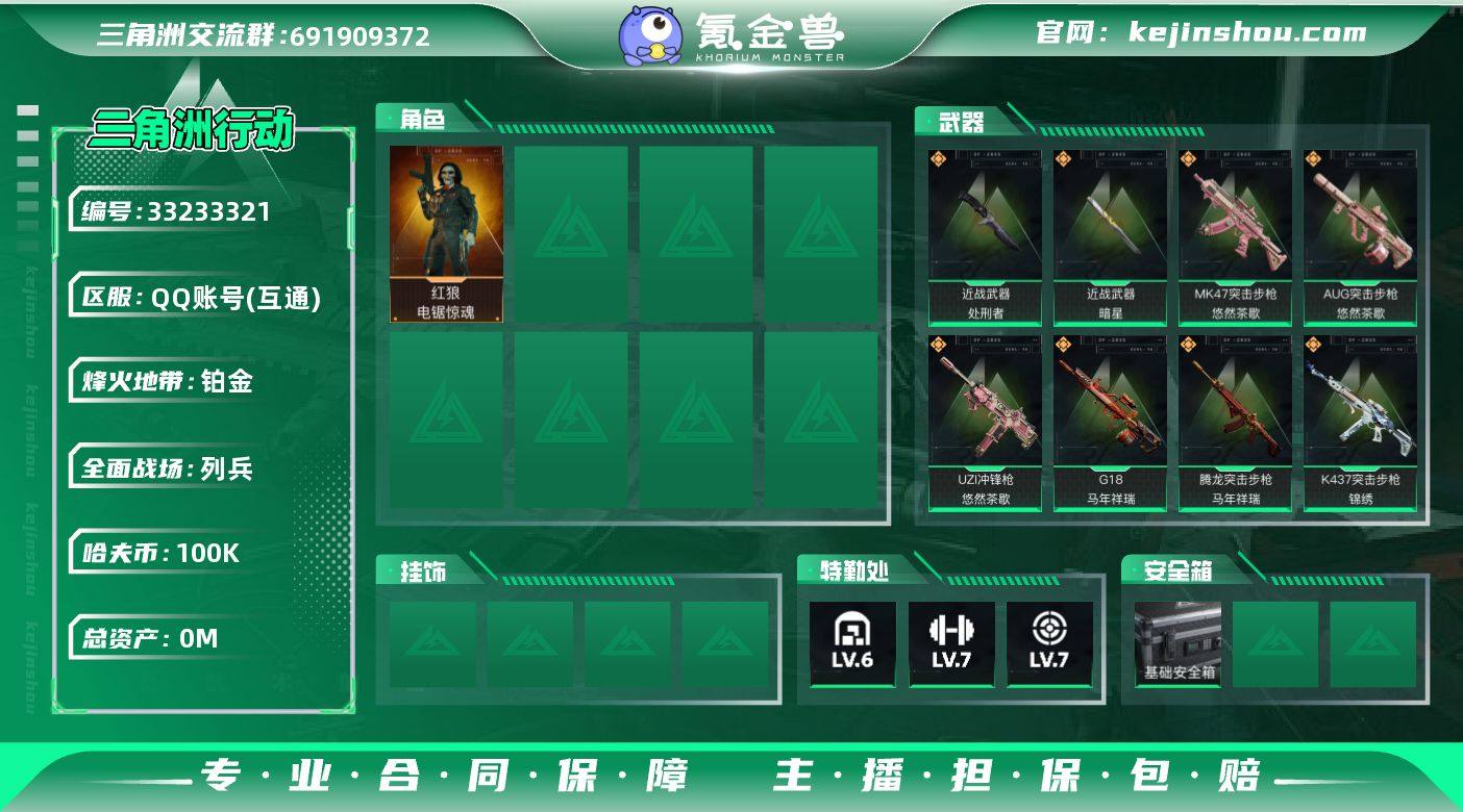 实名: 可修改 烽火地带段位: 铂金 全面战场段位: 列兵 总资产: 186 哈夫币: 100000 干员外观: 红狼-电锯惊魂 传说武器皮肤: M4A1突击步枪-阿米娅,Vector冲锋枪-能天使-午夜邮差,R93狙击步枪-维什戴尔,SCAR-H战斗步枪-启航,ASh-12战斗步枪-鹅鸭杀,QCQ171冲锋枪-鹅鸭杀,QJB201轻机枪-鹅鸭杀,KC17突击步枪-电锯惊魂,SKS射手步枪-骑士,近战-暗星,近战-处刑者,M14射手步枪-蛮荒,腾龙突击步枪-马年祥瑞,G18-马年祥瑞,勇士冲锋枪-万金泪冠,腾龙突击步枪-万金泪冠,AWM狙击步枪-万金泪冠,.357左轮-缄花,SR-25射手步枪-缄花,M14射手步枪-缄花,SMG-45冲锋枪-锦绣,K437突击步枪-锦绣,AKM突击步枪-锦绣,MK47突击步枪-悠然茶歇,AUG突击步枪-悠然茶歇,UZI冲锋枪-悠然茶歇