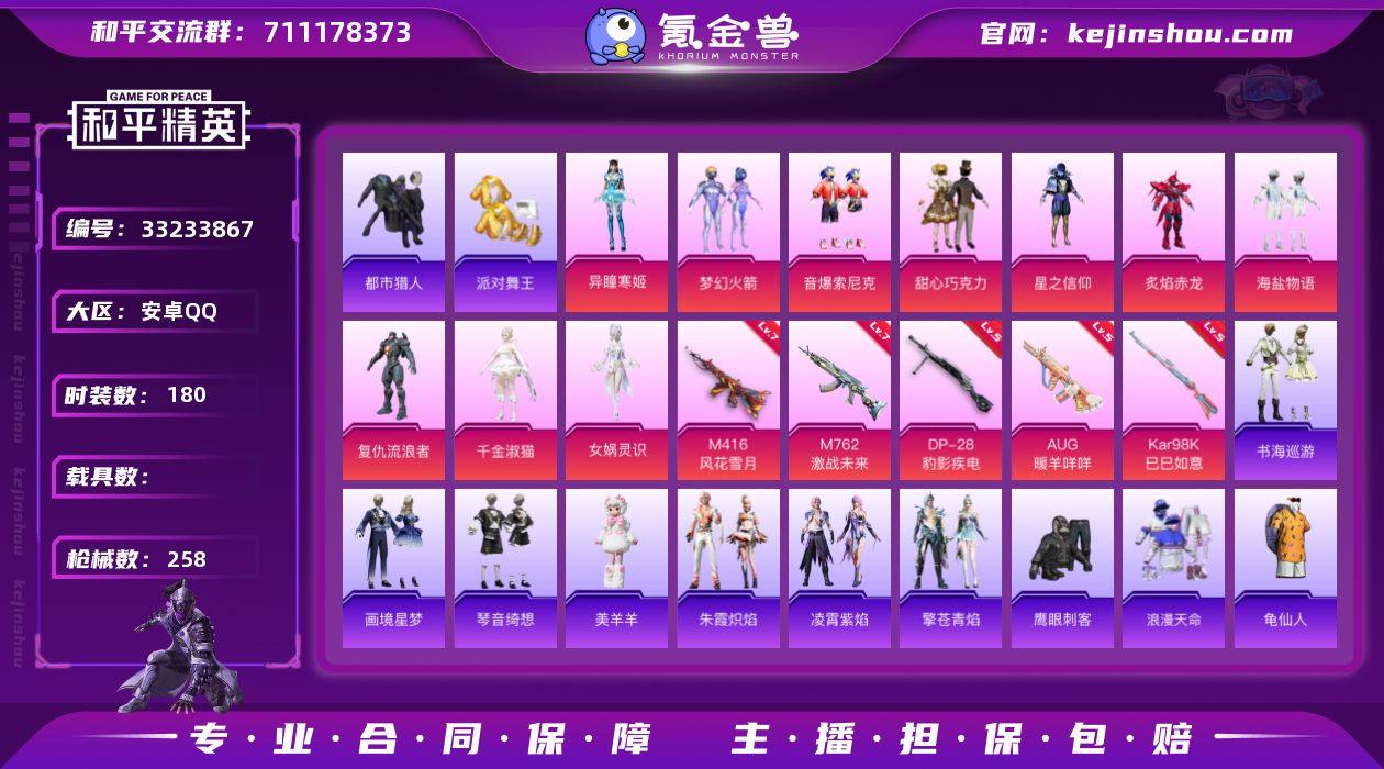 YZJ16782 无二次-4稀有10粉装8特效枪11热门180套装258枪皮 83309热力值 极品身法素材号 新火箭少女 巧克力三姐妹 千金淑猫 女娲灵识 海盐物语 星之信仰 都市 金鞋 红眼罩 天命 满级M4风花雪月 满级M762激战未来 满级AUG暖羊 13印记 历史卓越王牌9星 【4稀有】 都市猎人 浪漫天命 派对舞王 派对舞王(金靴子) 【10粉装】 梦幻火箭 女娲灵识 甜心巧克力 千金淑猫 异瞳寒姬 星之信仰 音爆索尼克 炙焰赤龙 海盐物语 复仇流浪者 【8特效枪】 AKS-74U-森灵之息 (5级) Kar98K-巳巳如意 (5级) DP-28-豹影疾电 (5级) AUG-暖羊咩咩 (5级) M762-激战未来 (7级) M416-风花雪月 (7级) Mk14-福马献瑞 (5级) ACE32-萌骑漫游 (2级) 【11热门】 龟仙人 鹰眼刺客 暗夜契约 暗影哥特 团圆交子 瑞龙福将 粉红小猪 漫步者 破蛋小黄鸡 英勇保护者 M762-瑞龙福将 【2飞行器】 星之信仰飞行翼 太空嘟嘟飞行器 【1头盔】 童趣迷兔头盔 【3背包】 梦幻火箭背包 幻影战神背包 深海小丑鱼背包 营地ID:767514587