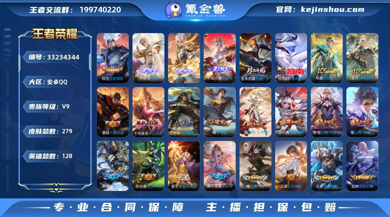 实名: 可修改 贵族等级: V9 英雄数: 128 皮肤数: 279 荣耀水晶: 弑枪猎影 无双皮: 花合斗,器灵·螭龙剑,无相 珍品传说: 怪盗基德,黑崎一护 传说皮: 云鹰飞将,绛天战甲,猫影幻舞,云霓雀翎,末日机甲-孙尚香,地狱火,海洋之心,李逍遥,淬星耀世,超时空战士-狄仁杰,山海·炽霜斩,山海·苍雷引,燃星之曲,黄金天蝎座,幻光神枪,死亡执政官,千山共赴,万灵伏威,神树通天,纵目迁山 限定皮: 李小龙,祈雪灵祝,岱宗,虎魄,时之彼端,飞衡,至尊宝,如梦令-后羿,孙行者,前尘镜,怒海麟威,山海·玄木吟,夏侯惇霜北刀,逐霄战戟,愿照·九州拓