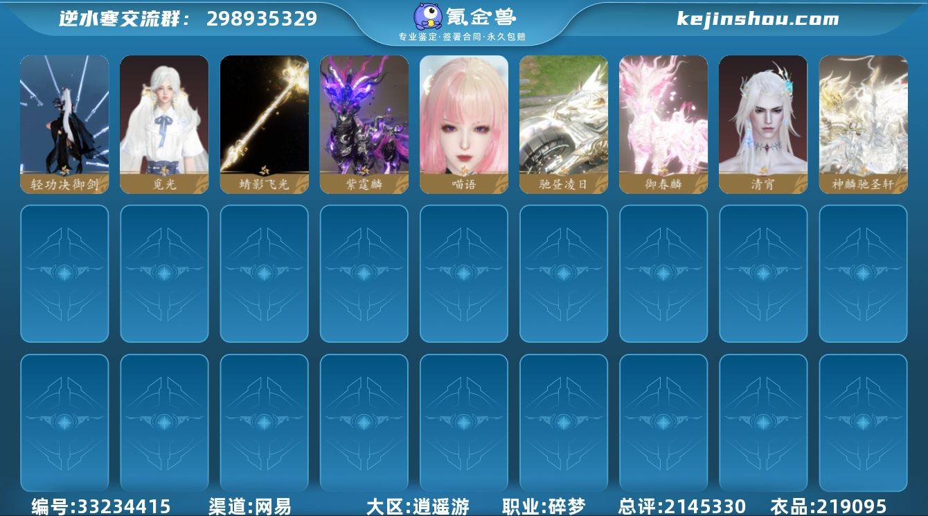 【区服】 扶摇万里 【充值称号】 把酒临风 【已用天赏石】 18 【天赏发型】 觅光, 清宵, 喵语 【天赏祥瑞】 神麟驰圣轩, 紫霆麟, 御春麟, 驰昼凌日 【天赏外观】 机械武器, 蜻蜓武器, 轻功诀御剑 【副本外观】 白夜拂雪*1, 紫宿宸极 【商城外观】 苍蓝微风, 烹椒听雀, 音律织光, 碎玉怜姻, 天籁闻歌, 闻鹤九皋, 跃动心芒, 朔雪从风, 逍遥千风, 灼金喵影, 云腾游雾, 灵语星彩, 川峦游墨, 云汉逢夕, 难负君思, 玄喵夜行, 紫微御宵, 暮云玄风, 白羽武器 【祥瑞坐骑】 风行·世间情, 风行·万灯明, 呆宝, 露荷, 布丁, 风行·江湖景, 云螭·探宇寻寰, 龙衔瑞焰, 甜点鼠鼠, 金冠鼠鼠, 碧茵海骐, 粉黛娇, 幻琉晶, 狂霸天, 沉木行马, 星河转·银昼, 星河转·金夕, 星河转·赤夜, 咩郎, 英杰, 墨流云·玄色, 墨流云·朱红, 墨流云·靛青, 奔虹赤, 独步悠然车, 犬威哮月, 犬威哮月·沧, 犬威哮月·焰, 玉霄飞练, 灵物志·花绒, 绒绒夜, 隐云涧 【武器环身】 狂鲨吞海, 纵剑为诀, 掌星执辰, 卧龙奇策 【灵韵内功】 沉渊, 昆吾断玉, 逢虚, 熔甲, 击衰 【铜币数量】 961300