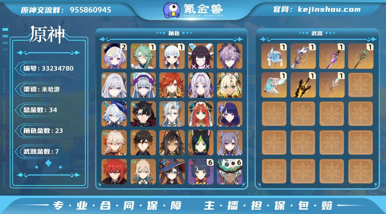 34黄!纳塔战舰!龙芙万希!魔导队!龙王!莱欧斯利!芙宁娜!希诺宁!玛薇卡!1+1神里绫华!1命白术!枫原万叶!钟离!雷电将军!妮露!茜特菈莉!丝柯克!杜林!0+1少女!1精武器: 天空之卷!和璞鸢!无工之剑!天空之脊!若水!冒险等级: 60!亮点: tap已注销