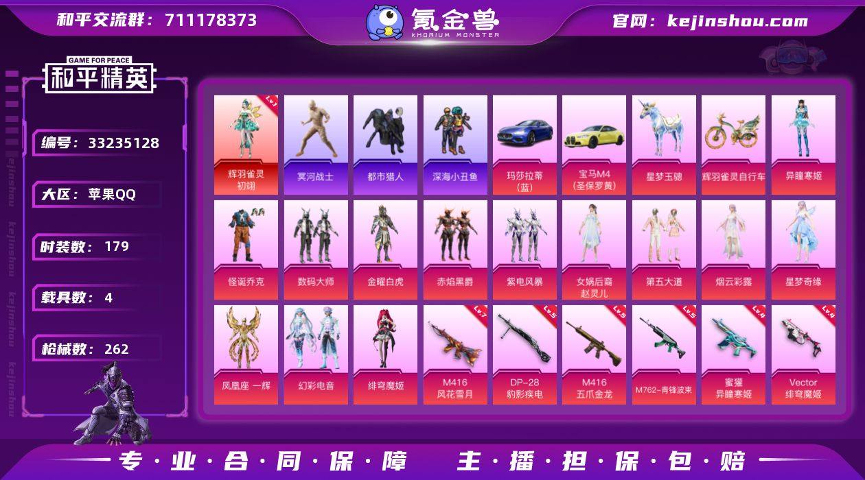 【954145】素材号-地铁满天赋-木乃伊-小丑-赵灵儿-都市-1级初翊-粉熊背包-国宝头盔/红眼罩/浪漫天命/深海小丑鱼/第五大道/数码大师/金曜白虎/烟云彩露/星梦奇缘/异瞳寒姬/绯穹魔姬/凤凰座一辉/幻彩电音/M4风花雪月7级/M4五爪金龙5级/M762青锋波束5级/蜜獾异瞳寒姬4级/MG3辉羽雀灵3级/玛莎拉蒂(蓝)/宝马(黄)/辉羽雀灵自行车/星梦玉骢(1神装13粉套9粉枪4载具)没战神框HP4716-6粉色飞行器-86740热力值-12王牌印记-179套装-262枪皮 【红色神装等级】:辉羽雀灵-初翊(一级) 【红色角色神装】:辉羽雀灵-初翊 【热门品类】:粉装-怪诞乔克,套装-浪漫天命,套装-都市猎人,套装-冥河战士,套装-深海小丑鱼,套装-小丑鱼,套装-金羽特工,套装-龟仙人,套装-暗影哥特,套装-粉红小猪,M416-星际漫游 【粉色套装】:粉装-数码大师,粉装-怪诞乔克,粉装-金曜白虎,粉装-赤焰黑爵,粉装-紫电风暴,女娲后裔-赵灵儿,粉装-第五大道,角色-烟云彩露,角色-星梦奇缘,角色-凤凰座 一辉,粉装-幻彩电音,角色-绯穹魔姬,角色-异瞳寒姬 【粉色枪皮等级】:M416-五爪金龙(五级),M416-风花雪月(七级),M762-青锋波束(五级),蜜獾-异瞳寒姬(四级),Vector-最终圣卫者(三级),Vector-绯穹魔姬...
