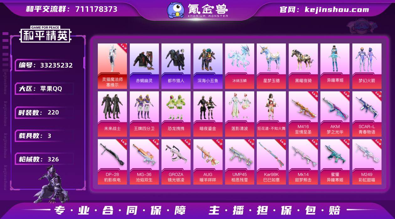 【954170】素材号-3级塞维尔/满级至情至圣M4/深海小丑鱼/赤蝎/都市/浪漫天命/红眼罩/未来战士/梦幻火箭/王牌四分卫/恐龙拽拽/暗夜鎏金/莲影清波/狂花道不知火舞/异瞳寒姬/AK梦之光华6级/AUG暖羊咩咩5级/SCAR青春物语6级/UMP相思残雪5级/蜜獾异瞳寒姬4级/M249彩虹甜喵4级/AK74U森灵之息3级/冰绡玉鳞/星梦玉骢/黑曜夜骑(1神装8粉套13粉枪3载具)没战神框HP5183-6粉色飞行器-108276热力值-18王牌印记-220套装-326枪皮 【红色神装等级】:灵猫魔法师-塞维尔(三级) 【红色角色神装】:灵猫魔法师-塞维尔 【热门品类】:粉装-梦幻火箭,套装-浪漫天命,套装-赤蝎幽灵,套装-都市猎人,套装-深海小丑鱼,角色-军刀雅典娜,套装-金羽特工,套装-忍者信条,套装-龟仙人,套装-暗影哥特 【粉色套装】:粉装-未来战士,粉装-梦幻火箭,粉装-王牌四分卫,粉装-恐龙拽拽,粉装-暗夜鎏金,粉装-莲影清波,角色-狂花道·不知火舞,角色-异瞳寒姬 【粉色枪皮等级】:AKM-梦之光华(六级),SCAR-L-青春物语(六级),M416-至情至圣(九级),GROZA-镜光银凌(五级),AUG-暖羊咩咩(五级),蜜獾-异瞳寒姬(四级),UMP45-相思残雪(五级),AKS-74U-森灵之息(三级),Kar98K-巳巳如意(五级),Mk14-甜梦熊击(...