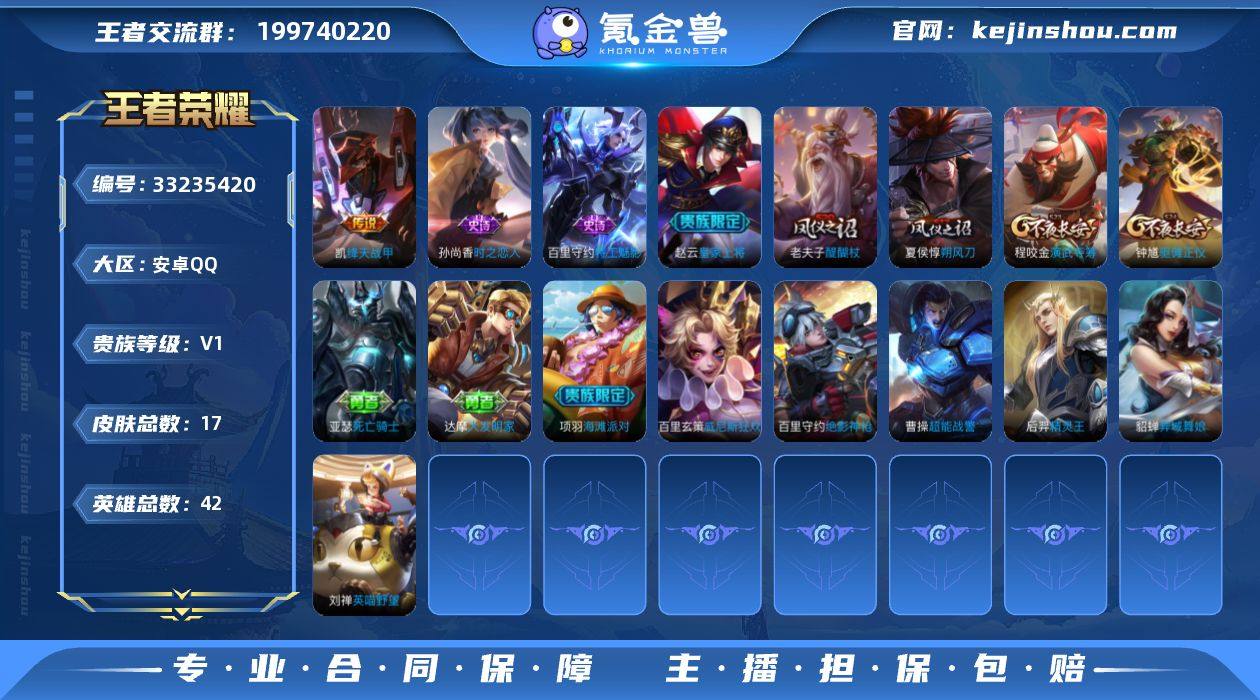 【954251】安卓Q-Vnull-null段位-42英雄-17皮肤-1传说-3史诗 【传说皮肤】:铠绛天战甲 【限定皮肤】:赵云皇家上将,夏侯惇朔风刀,项羽海滩派对,老夫子醍醐杖,程咬金演武夺筹,钟馗驱傩正仪 【赛季限定】:夏侯惇朔风刀,老夫子醍醐杖,程咬金演武夺筹,钟馗驱傩正仪 【史诗皮肤】:赵云皇家上将,百里守约特工魅影,孙尚香时之恋人 【其他皮肤】:项羽海滩派对,达摩大发明家,亚瑟死亡骑士,夏侯惇朔风刀,老夫子醍醐杖,程咬金演武夺筹,钟馗驱傩正仪,貂蝉异域舞娘,曹操超能战警,后羿精灵王,刘禅英喵野望,百里守约绝影神枪,百里玄策威尼斯狂欢 【