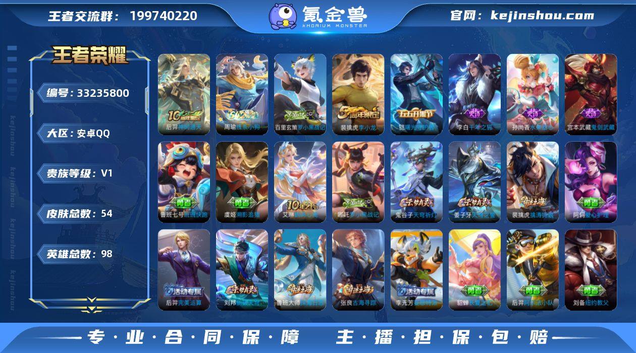 【954320】安卓Q-V0-永恒钻石III段位-98英雄-54皮肤-1传说-6史诗 【传说皮肤】:后羿神树通天 【限定皮肤】:姜子牙天穹之誓,狄仁杰阴阳师,裴擒虎李小龙,裴擒虎擒涛扼浪,鲁班大师探海日志,张良古海寻踪,鬼谷子天穹祈灯,沈梦溪龙舞盛年,刘邦剑破天穹,程咬金群星魔术团,周瑜熔金海岸 【赛季限定】:裴擒虎擒涛扼浪,鲁班大师探海日志,张良古海寻踪,鬼谷子天穹祈灯,刘邦剑破天穹,姜子牙天穹之誓 【战令限定】:周瑜线条小狗 【史诗皮肤】:周瑜线条小狗,百里玄策罗小黑战记,裴擒虎李小龙,铠曙光守护者,李白千年之狐,孙尚香水果甜心,宫本武藏鬼剑武藏 【其他皮肤】:鲁班七号班班快跑,虞姬溯影追猎,艾琳鹤鸣心笺,哪吒罗小黑战记,周瑜熔金海岸,姜子牙天穹之誓,貂蝉长夏之忆,程咬金群星魔术团,刘邦剑破天穹,沈梦溪龙舞盛年,鬼谷子天穹祈灯,后羿完美运算,张良古海寻踪,李元芳妄想特派,鲁班大师探海日志,裴擒虎擒涛扼浪,刘禅唤灵魔甲,鲁班大师乓乓大师,狂铁特工战影,狂铁命运角斗场,刘备汉昭烈帝,刘备纽约教父,狄仁杰阴阳师,后羿阿尔法小队,宫本武藏万象初新,张飞五福同心,花木兰兔女郎,典韦黄金武士,妲己少女阿狸,牛魔西部大镖客,...