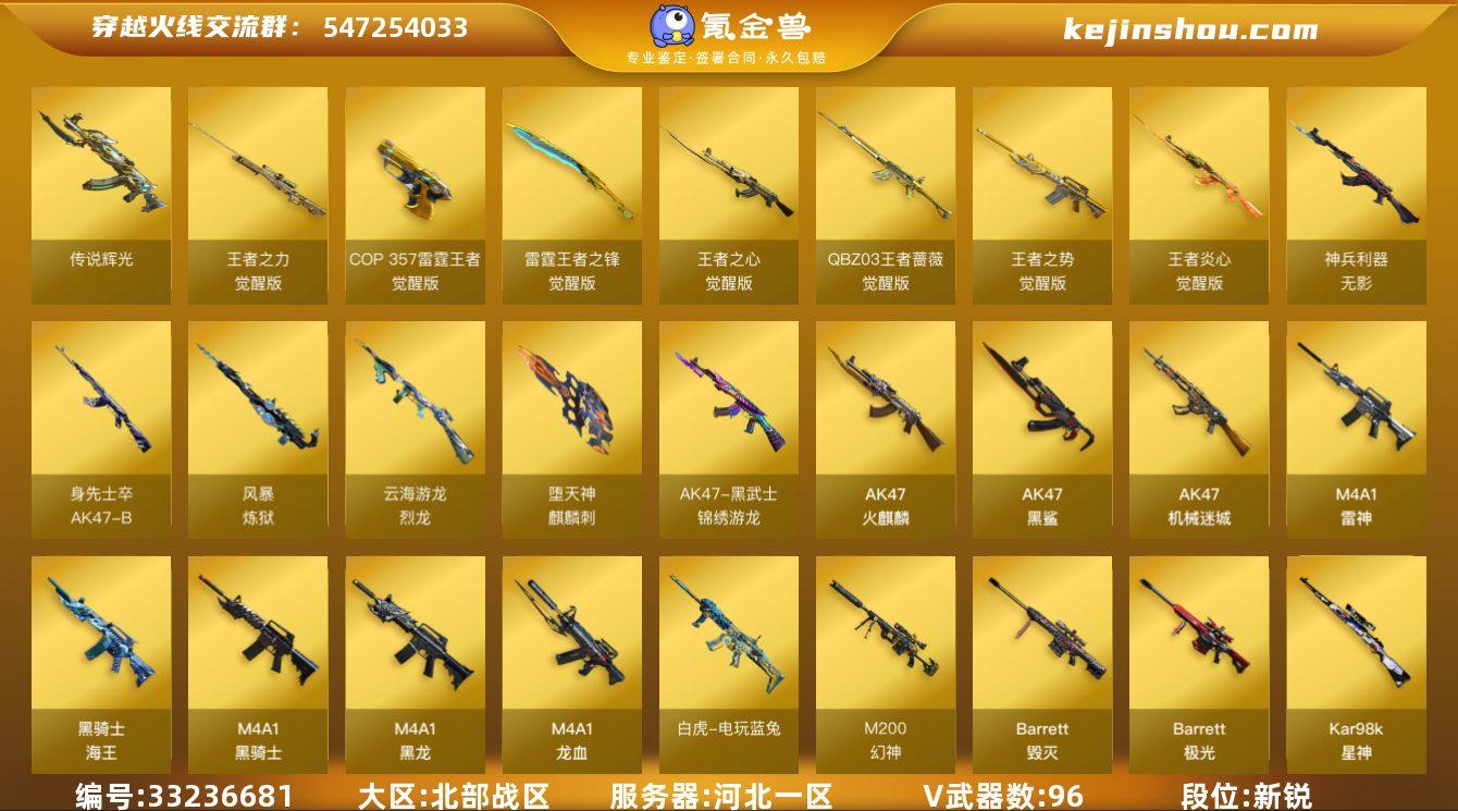 河北一区-108V-13王者武器数-0炫金武器数 【传说武器】:传说辉光 【热门武器】:传说辉光,Scar Light-白虎,HK417-朱雀,M200-幻神,白虎-电玩蓝兔,Kar98K-星神,C.A.T,炼狱-迷你小钢,毒蜂,M4A1-黑骑士*3,汤姆逊-烈龙*6,RPK-盘龙*6,加特林-炼狱,斯泰尔-蝴蝶,羊驼玩偶,火麒麟-绝迹,COP-白鲨,USP-雷暴,沙鹰-修罗*9 【王者炫金武器】:高爆手雷-雷霆王者*2 【音效卡】:烈火-动感闪耀 音效卡,M4A1-黑龙音效卡,M4A1-黑骑士音效卡,Barrett-毁灭音效卡 【皮肤】:幻神-动感闪耀 皮肤,雷神-暗月,雷神-星空,火麒麟-华夏之心,火麒麟-心动糖果,毁灭耀金皮肤,毁灭-黑大圣皮肤,毁灭-风暴*2,毁灭-直播专属,毁灭-英雄计划 皮肤,黑龙-能量核心,黑骑士-地狱火,无影-能量核心,战神-粉色甜心皮肤,战神-紫绶金章皮肤*2,战神-流金岁月皮肤,AK47-B-常胜将军-曹操,AK47-B-常胜将军-刘备*3,AK47-B-常胜将军-孙权*2 【角色】:樱,王者-瞳-闭月羞花,王者-葵-貂蝉,王者-魅影,蛇隐宗,乔伊教练,修道士,云海玲珑,暗夜-X,北极狐-X,初恋灵狐,芳心审判者,风暴女,虎妞,嘉年华灵狐,娟娟,兰-新年限定,灵动武士,灵狐者-X,龙儿,麻雀,曼陀罗-X,潘多拉-X,...