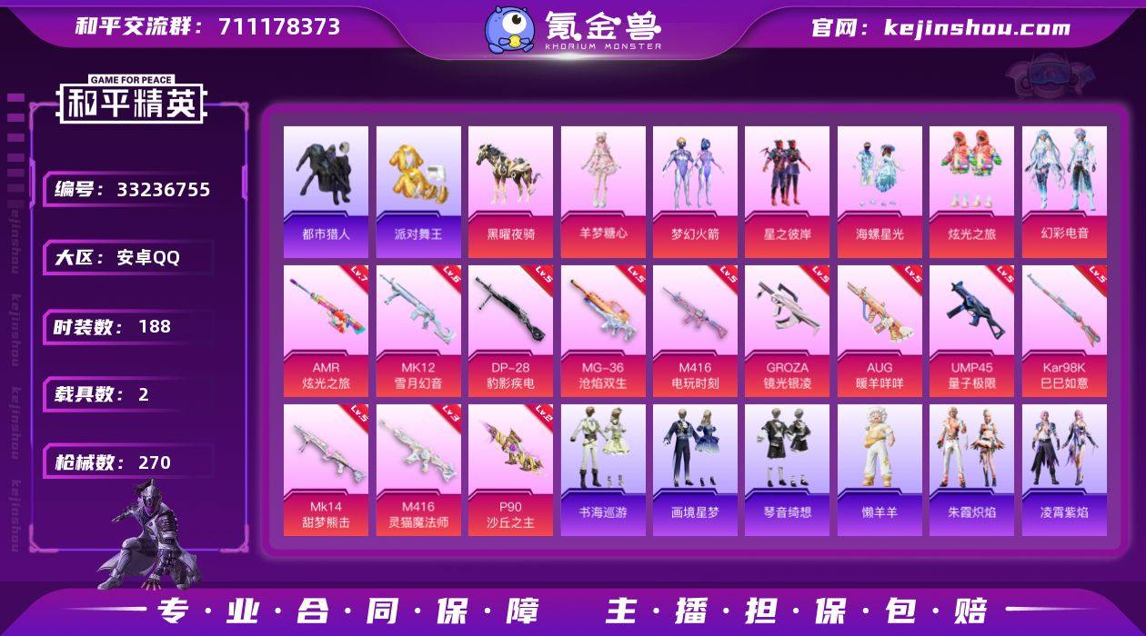 【954662】身法号-羊梦糖心/AUG暖羊咩咩5级/M4电玩时刻5级/M4灵猫魔法师3级/蓝螳螂/派对舞王/都市/浪漫天命/老六服/晶辉守护/秘语星愿/小鸟芋圆/懒羊羊/唐三/朱竹清/火箭少女/星之彼岸/海螺星光/炫光之旅/幻彩电音/AMR炫光之旅7级/MK12雪月幻音6级/ACE32萌骑漫游5级/狗砸镜光银凌5级/Mk14甜梦熊击5级/黑曜夜骑/霜月冰狼(6粉装14粉枪2载具)没战神框 HP6808-8粉色飞行器-83518热力值-14王牌印记-188套装-270枪皮 【热门品类】:粉装-梦幻火箭,套装-浪漫天命,套装-都市猎人,套装-派对舞王,套装-龟仙人,角色-Mark.06 【粉色套装】:粉装-梦幻火箭,粉装-星之彼岸,粉装-海螺星光,粉装-炫光之旅,粉装-幻彩电音,角色-羊梦糖心 【粉色枪皮等级】:M416-电玩时刻(五级),M416-灵猫魔法师(三级),GROZA-镜光银凌(五级),AUG-暖羊咩咩(五级),ACE32-萌骑漫游(五级),UMP45-量子极限(五级),P90-沙丘之主(二级),Kar98K-巳巳如意(五级),Mk14-甜梦熊击(五级),Mk14-福马献瑞(三级),AMR-炫光之旅(七级),MK12-雪月幻音(六级),DP-28-豹影疾电(五级),MG-36-沧焰双生(五级) 【粉色载具】:黑曜夜骑,霜月冰狼 【粉色枪皮】:M416-电玩时刻,M416-灵猫魔法师,GROZA-镜光银凌,AU...