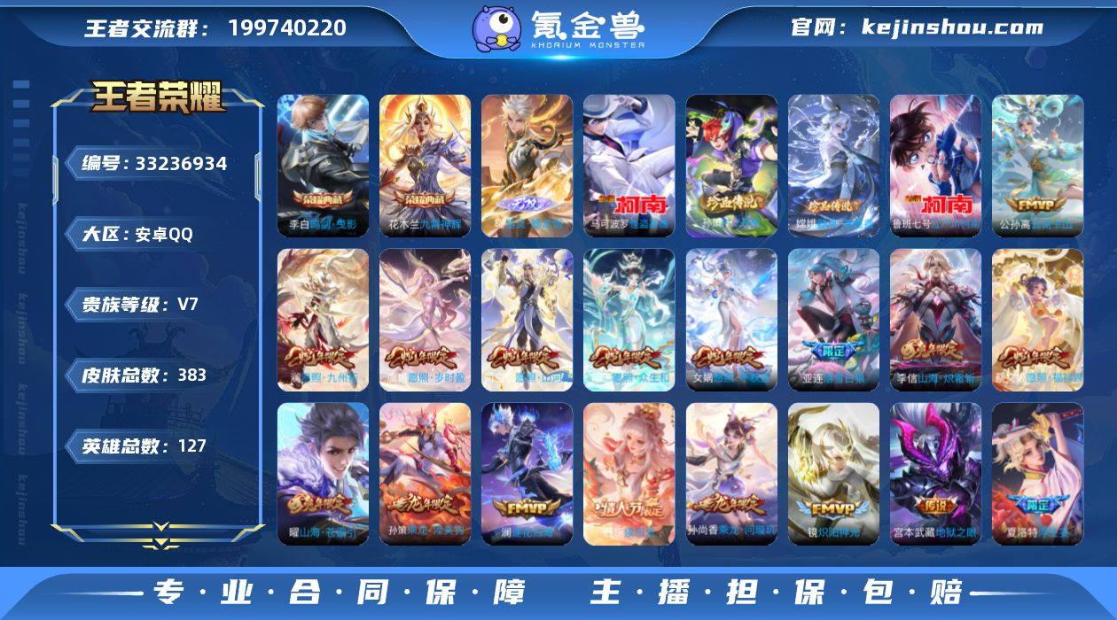 【954608】安卓Q-V7-永恒钻石III段位-127英雄-383皮肤-2典藏皮肤-1无双-4珍品传说-41传说-126史诗 【英雄全皮】:孙权全皮,苍全皮,百里守约全皮,夏洛特全皮,司空震全皮,戈娅全皮,空空儿全皮,影全皮 【荣耀典藏】:李白鸣剑曳影,花木兰九霄神辉 【无双皮肤】:曜器灵螭龙剑 【珍品传说】:嫦娥器灵落星盏,孙策时之奇旅,鲁班七号江户川柯南,马可波罗怪盗基德 【传说皮肤】:公孙离云诺千山,西施续相思,司空震愿照山河定,女娲愿照千秋盛,妲己愿照众生和,澜愿照九州拓,蔡文姬愿照福禄聚,虞姬愿照岁时盈,云缨幻光神枪,裴擒虎祥瑞亨通,桑启鸣野蒿,亚连落雪白狼,孙尚香乘龙问璇玑,孙策乘龙淬吴钩,澜逐花归海,上官婉儿妄想奇谈,马可波罗妄想实况,夏洛特浮生妄,干将莫邪画中仙,花木兰燃星之曲,伽罗炽翼辉光,曜山海苍雷引,李信山海炽霜斩,吕布怒海麟威,李白诗剑行,百里守约碎云,马超无双飞将,赵云淬星耀世,王昭君乞巧织情,铠绛天战甲,镜炽阳神光,虞姬启明星使,孙悟空零号赤焰,曜云鹰飞将,李信一念神魔,刘备时之恋人,干将莫邪久胜战神,后羿黄金射手座,孙尚香末日机甲,宫本武藏地狱之眼,狄仁杰超时空战士 【限定皮肤】:蔡文姬夏日便...