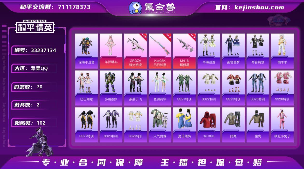 【954598】公主号-地铁马上满天赋-艾丽娅2级/羊梦糖心/M4超新星3级/深海小丑鱼/懒羊羊/冰公主/小舞/小舞恋语/M24虎痴许褚6级/狗砸镜光银凌5级/暮色幽蹄/九霄玄鹿(1神装-3粉装-4粉枪-2载具)没战神框 HP6677-3粉色飞行器-33865热力值-2王牌印记-70套装-102枪皮 【红色神装等级】:暮色玫影-艾丽娅(二级) 【红色角色神装】:暮色玫影-艾丽娅 【热门品类】:套装-深海小丑鱼 【粉色套装】:角色-羊梦糖心,人物-小舞,人物-小舞·恋语 【粉色枪皮等级】:M416-超新星(三级),GROZA-镜光银凌(五级),Kar98K-巳巳如意(五级),M24-虎痴许褚(六级) 【粉色载具】:暮色幽蹄,九霄玄鹿 【粉色枪皮】:M416-超新星,GROZA-镜光银凌,Kar98K-巳巳如意,M24-虎痴许褚 【粉色飞行器】:炫彩糖果飞行器,暮色之舞飞行器,云梦轻舟飞行器 【粉色降落伞】:闲梦青缨降落伞,莲影清波降落伞,精灵梦叶罗丽降落伞,千金淑猫降落伞,炫彩糖果降落伞,暮色玫影降落伞,灵驹仙姬降落伞,小舞降落伞 【稀有套装】:套装-巳巳如意,套装-炫彩糖果,角色-多纳泰罗,套装-燕燕于飞,套装-鱼渊荷华,玩偶服-懒羊羊,套装-书海巡游,套装-画境星梦,套装-琴音绮想 【稀有枪皮】:AKM-冰凉西瓜,M16A4-莲影...