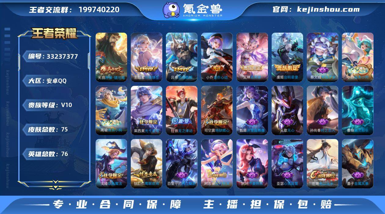 【954621】安卓Q-V10-最强王者段位-76英雄-75皮肤-6传说-22史诗 【传说皮肤】:关羽神骥镇沧海,王昭君长夜焕生,艾琳觅芳踪,吕布怒海麟威,小乔音你心动,虞姬启明星使 【限定皮肤】:狄仁杰阴阳师,赵云皇家上将,庄周高山流水,元歌无心,狄仁杰魔术师,项羽海滩派对,孙悟空美猴王,虞姬启明星使,西施玲珑珍味,鲁班大师探海日志,戈娅驭风魔法,艾琳流音漫舞,司空震地狱燃心,阿古朵江河有灵,张良古海寻踪,艾琳觅芳踪,鬼谷子天穹祈灯 【年限皮肤】:孙悟空美猴王 【赛季限定】:鲁班大师探海日志,张良古海寻踪,鬼谷子天穹祈灯,亚瑟荣光之誓 【战令限定】:戈娅驭风魔法,西施玲珑珍味,司空震地狱燃心,艾琳流音漫舞,莱西奥光弋星穹,明世隐往忆晖光,周瑜线条小狗,小乔线条小狗 【史诗皮肤】:蔡文姬奇遇梦乡,周瑜线条小狗,小乔线条小狗,莱西奥光弋星穹,狂铁龙之律动,阿古朵江河有灵,司空震地狱燃心,戈娅驭风魔法,元歌无心,庄周高山流水,孙尚香时之恋人,狄仁杰鹰眼统帅,阿轲节奏热浪,程咬金功夫厨神,百里守约特工魅影,亚瑟心灵战警,曹操幽灵船长,墨子金属风暴,妲己魅力维加斯,廉颇地狱岩魂,狄仁杰魔术师,甄姬冰雪圆舞曲,赵云皇家上将...