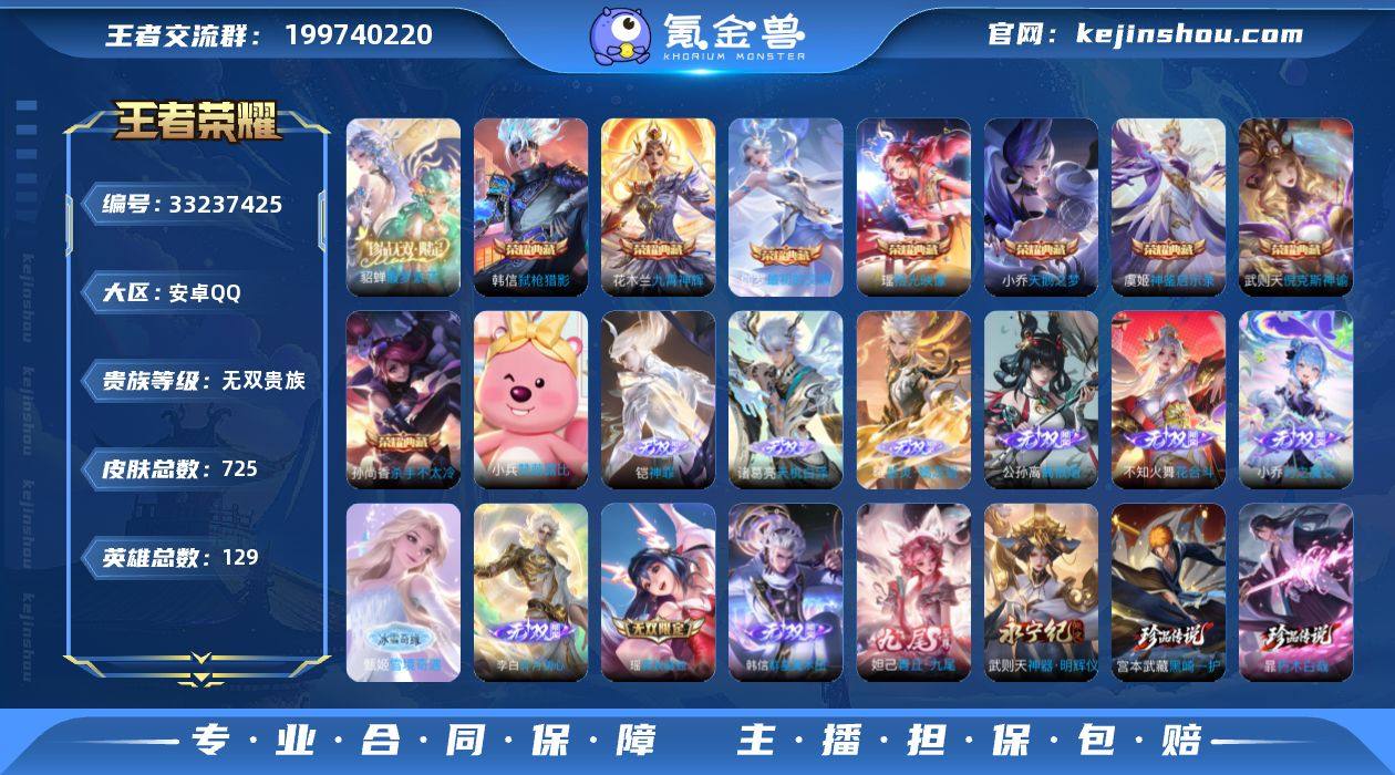【954688】安卓Q-V11-最强王者段位-129英雄-725皮肤-8典藏皮肤-1典藏英雄-1珍品无双-12无双-9珍品传说-132传说-258史诗 【英雄全皮】:廉颇全皮,小乔全皮,墨子全皮,妲己全皮,孙尚香全皮,刘禅全皮,高渐离全皮,元歌全皮,甄姬全皮,狄仁杰全皮,达摩全皮,武则天全皮,司马懿全皮,露娜全皮,姜子牙全皮,韩信全皮,孙权全皮,王昭君全皮,兰陵王全皮,花木兰全皮,艾琳全皮,不知火舞全皮,朵莉亚全皮,娜可露露全皮,橘右京全皮,牛魔全皮,刘备全皮,张飞全皮,杨玉环全皮,苍全皮,杨戬全皮,女娲全皮,哪吒全皮,蔡文姬全皮,鬼谷子全皮,大乔全皮,黄忠全皮,苏烈全皮,百里玄策全皮,百里守约全皮,弈星全皮,梦奇全皮,公孙离全皮,沈梦溪全皮,明世隐全皮,狂铁全皮,米莱狄全皮,瑶全皮,云中君全皮,盾山全皮,孙策全皮,猪八戒全皮,上官婉儿全皮,亚连全皮,嫦娥全皮,大司命全皮,马超全皮,敖隐全皮,海月全皮,曜全皮,西施全皮,蒙犽全皮,鲁班大师全皮,蒙恬全皮,镜全皮,阿古朵全皮,桑启全皮,夏洛特全皮,司空震全皮,云缨全皮,金蝉全皮,暃全皮,赵怀真全皮,戈娅全皮,空空儿全皮,影全皮,海诺全皮,少司缘全皮 【荣耀典藏】:武则天英雄,武...