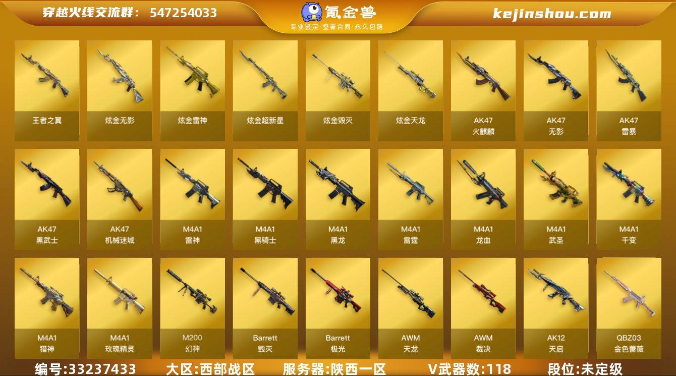 陕西一区-130V-5王者武器数-6炫金武器数 【热门武器】:QBZ03-金色蔷薇*2,Scar Light-白虎,M200-幻神,QBZ03-街机,M4A1-黑骑士,汤姆逊-烈龙*6,加特林-炼狱,斯泰尔-蝴蝶,USP-雷暴*3,沙鹰-修罗*5 【王者炫金武器】:王者之翼,炫金骑士,炫金无影,炫金雷神,炫金超新星,炫金毁灭,炫金天龙 【音效卡】:加特林-炼狱音效卡,AK47-火麒麟音效卡,M4A1-雷神音效卡,Barrett-毁灭音效卡,Scar Light-白虎音效卡,Barrett-碧霄极光音效卡,死神-雪域霜狐-怀旧音效卡,AWM-昌龙-怀旧音效卡 【皮肤】:幻神-周瑜皮肤,裁决-星际旅行 皮肤,烈龙-星空,雷神-暗月,雷神-能量核心,雷神-星空,雷神-虎将,毁灭耀金皮肤,毁灭-英雄计划 皮肤,黑龙-能量核心,无影耀金皮肤,战神-粉色甜心皮肤,战神-紫绶金章皮肤*3,AWM-天龙-传奇70KG,修罗-能量核心,屠龙-荣耀之锋*2,屠龙-定军扬威 皮肤*2,擎天-秘银,麒麟刺-萌杀皮肤 【角色】:葵,樱,魅影,炫,春,晴雅,零·纪元,战地猎狐,不败狙神,王者之瞳,王者-救世主,王者-迷迭香,乔伊教练,修道士,空,暗夜-X,初恋灵狐,风暴女,娟娟,兰妹妹,灵狐者-黄金海岸,潘多拉-X,潘多拉-甜心教官,斯沃特-X,影武者-X,团团 【...