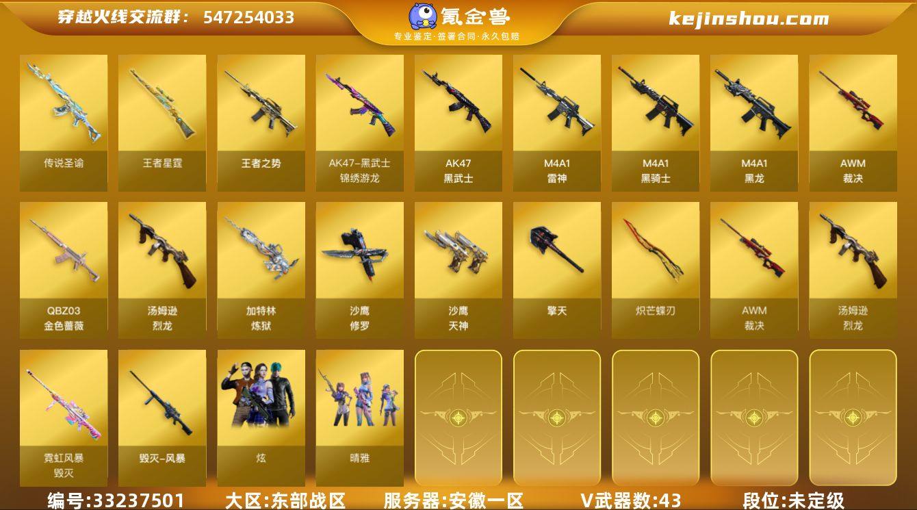 安徽一区-43V-3王者武器数-0炫金武器数 【传说武器】:传说圣谕 【热门武器】:传说圣谕,QBZ03-金色蔷薇,M4A1-黑骑士,汤姆逊-烈龙*3,加特林-炼狱,沙鹰-修罗,炽芒蝶刃*2 【王者炫金武器】:王者之势,王者玄武,王者星霆 【音效卡】:M4A1-雷神音效卡,AWM-裁决音效卡 【皮肤】:星神-黯钢战甲 皮肤,毁灭-风暴 【角色】:晴雅,荆棘,零·纪元,奇洋探员,乔伊教练,暗夜-X,飞虎队-X,风暴女,娟娟,猎狐者-追月,灵狐者-X,龙儿,潘多拉-X,潜龙队-X,青霞仙子,游珑儿,潘多拉-N 【人偶武器】:火麒麟-灵狐,异变清道夫-蛇影双骄,迷你牛牛,迷你生化手雷*2 【暴走生化】:超级对讲机 【挑战大师】:冰龙粉碎者-白马银枪 【英雄级武器】:M4A1-黑龙,M4A1-雷神,M4A1-黑骑士,AK47-黑武士,QBZ03-金色蔷薇,黑武士-锦绣游龙,SCAR Light-玄豹,王者玄武-觉醒版,机械迷城-穹宇,AWM-裁决,加特林-炼狱,汤姆逊-烈龙*3,沙鹰-修罗,沙鹰-天神*3,Anaconda-玄豹*2,USP-冥王*5,擎天*2,尼泊尔-雷霆,炽芒蝶刃*2,龙啸-热带奇洋,丛林匕首-玄豹,高爆手雷-雷霆,手雷-热带奇洋,高爆手雷-玄豹*3,闪光弹-雷霆,闪光弹-云龙,闪光弹-玄豹,烟雾弹-雷霆,烟雾弹-玄豹*2,M...